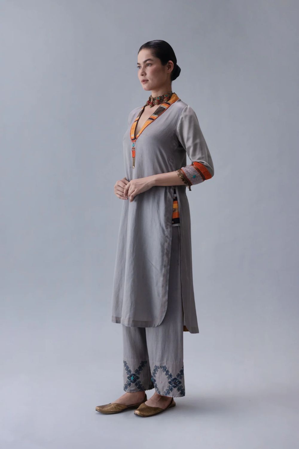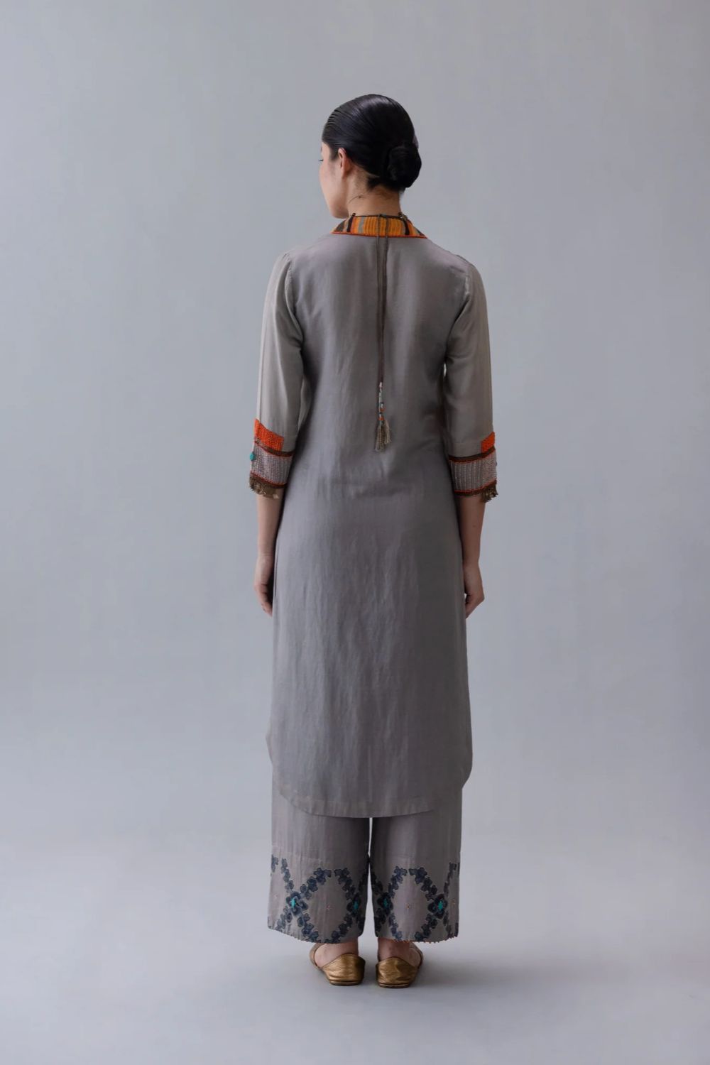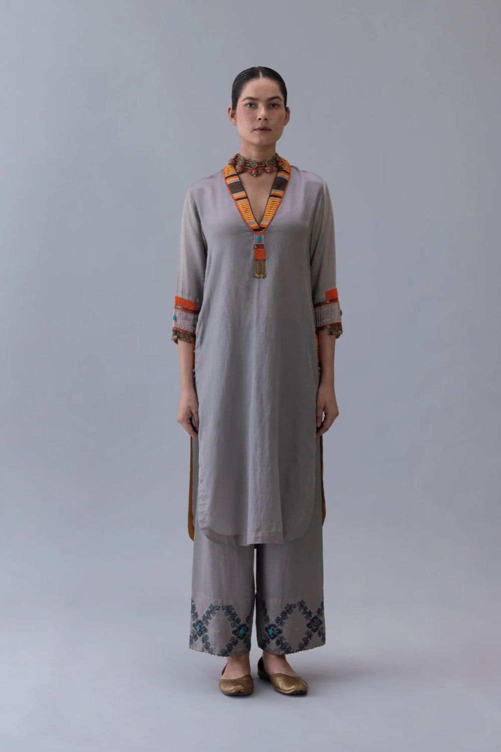 Dzong kurta in grey silk cotton satin, featuring a structured V-collar highlighted with beadwork. orange facings at neckline and hem, with intricate adda cuffs, add depth, contrast, and refined character. Country of origin: India