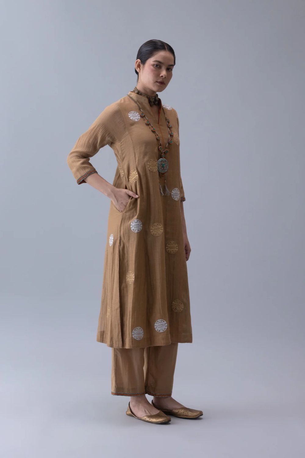 Qin kurta in fine stone Chanderi, featuring a round collar with embroidery and orange piping. Gold and silver laser-cut motifs with intricate adda sleeves and hem facing bring modern detail to tradition. Country of origin: India