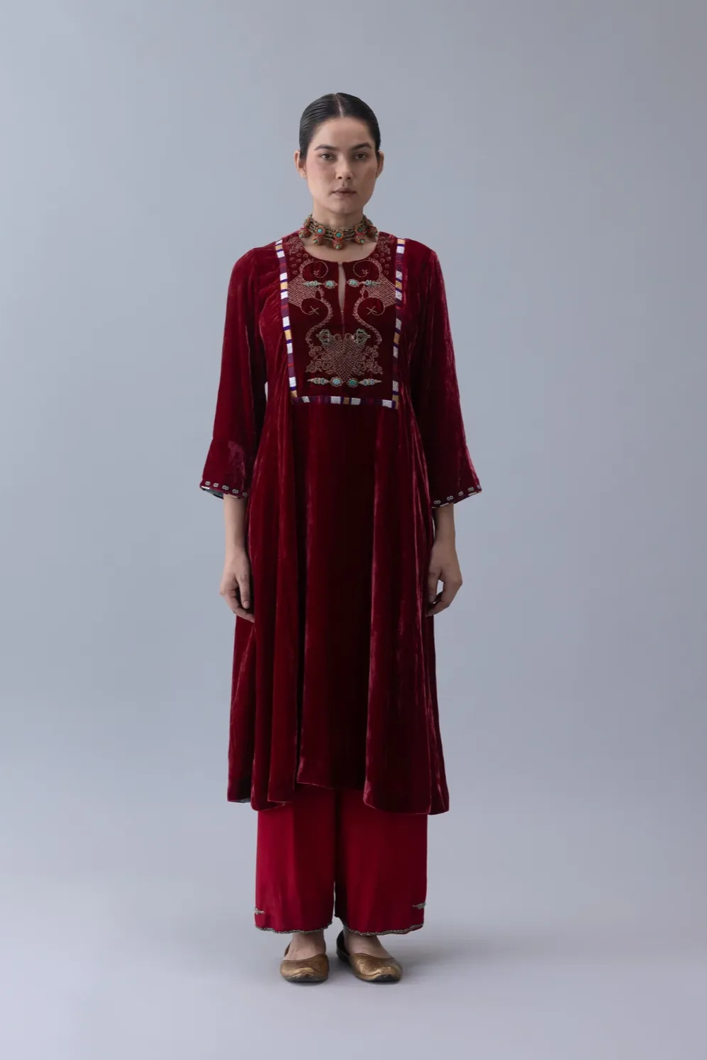 Varja kurta in burgundy silk velvet yhat has a round neckline with slit, intricate front and back yokes framed with patti, delicate embroidery motifs, adda-detailed sleeve slits, and a haze shantoon hem finish. Country of origin: India