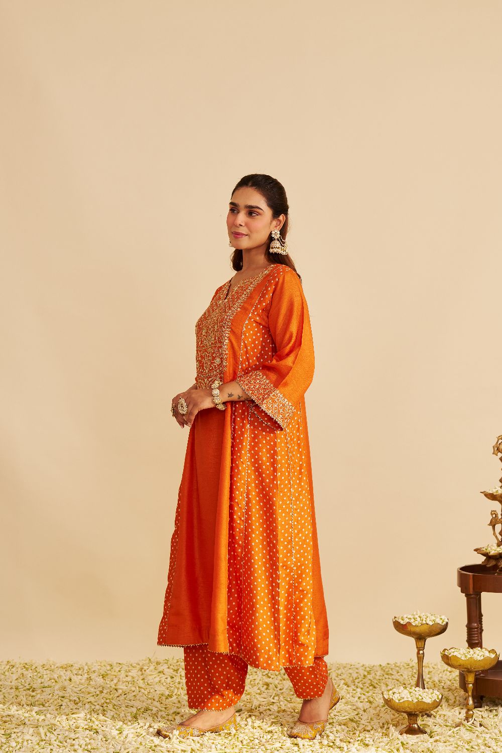Paired with a traditional Dogri salwar, the ensemble is finished with Bandhej and gota detailing, blending artisanal charm with sophisticated style.