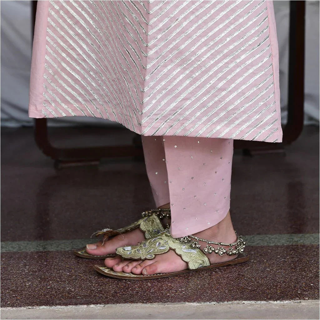 A line kurta with gota panels on the sides, paired with an old fashioned dabka embroidered narrow salwar, both in cotton mul. Set is paired with a hand embroidered gota dupatta in a Mughal jaali inspired design in handspun chanderi fabric.