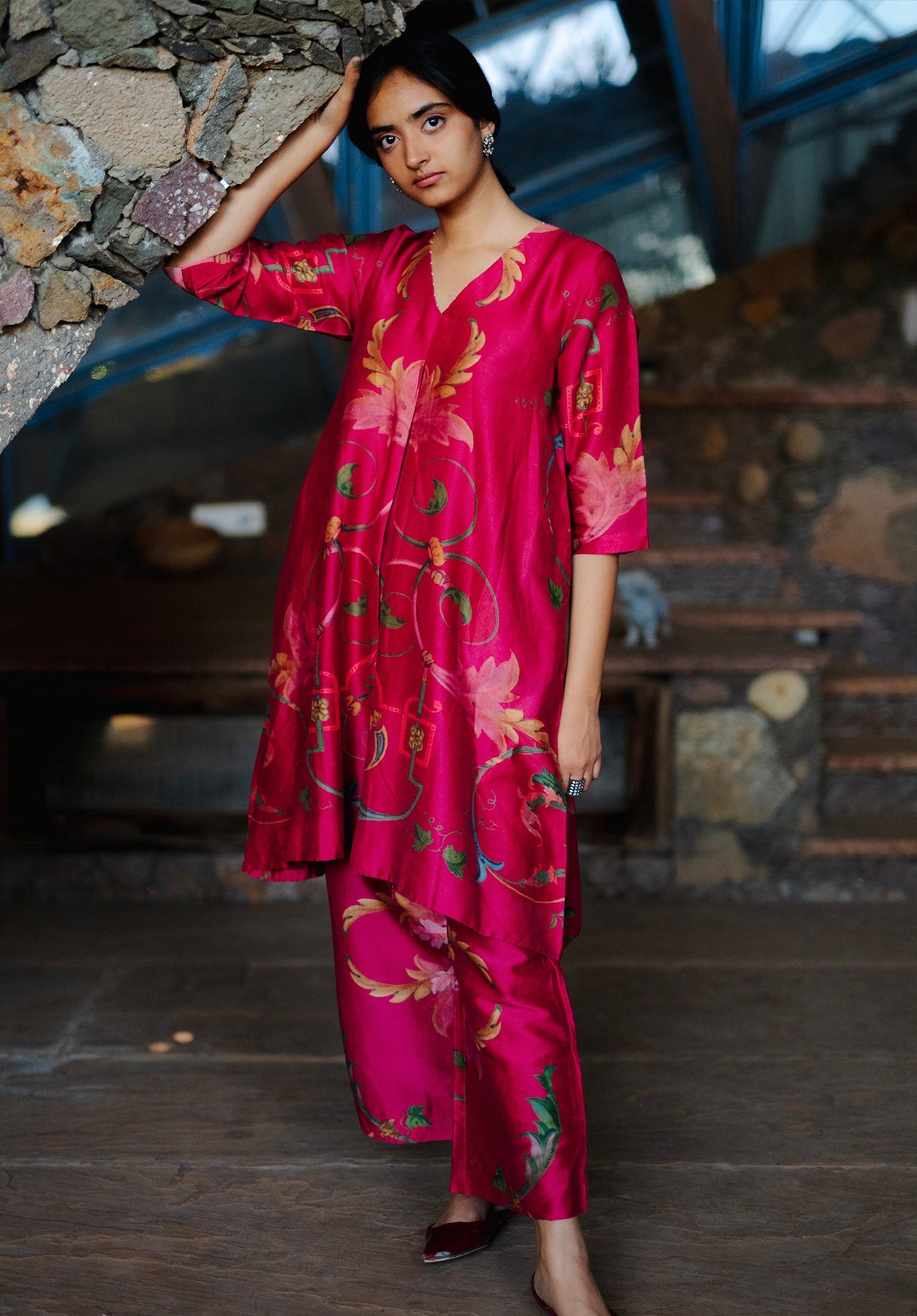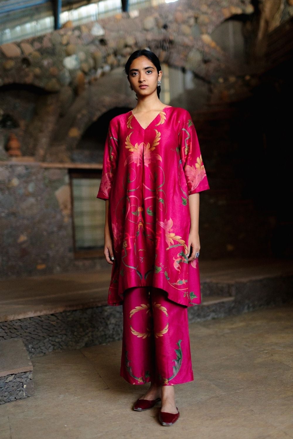 Rani Roses Silk chanderi set features an unusual placement of florals on a branch in a rani pink base.