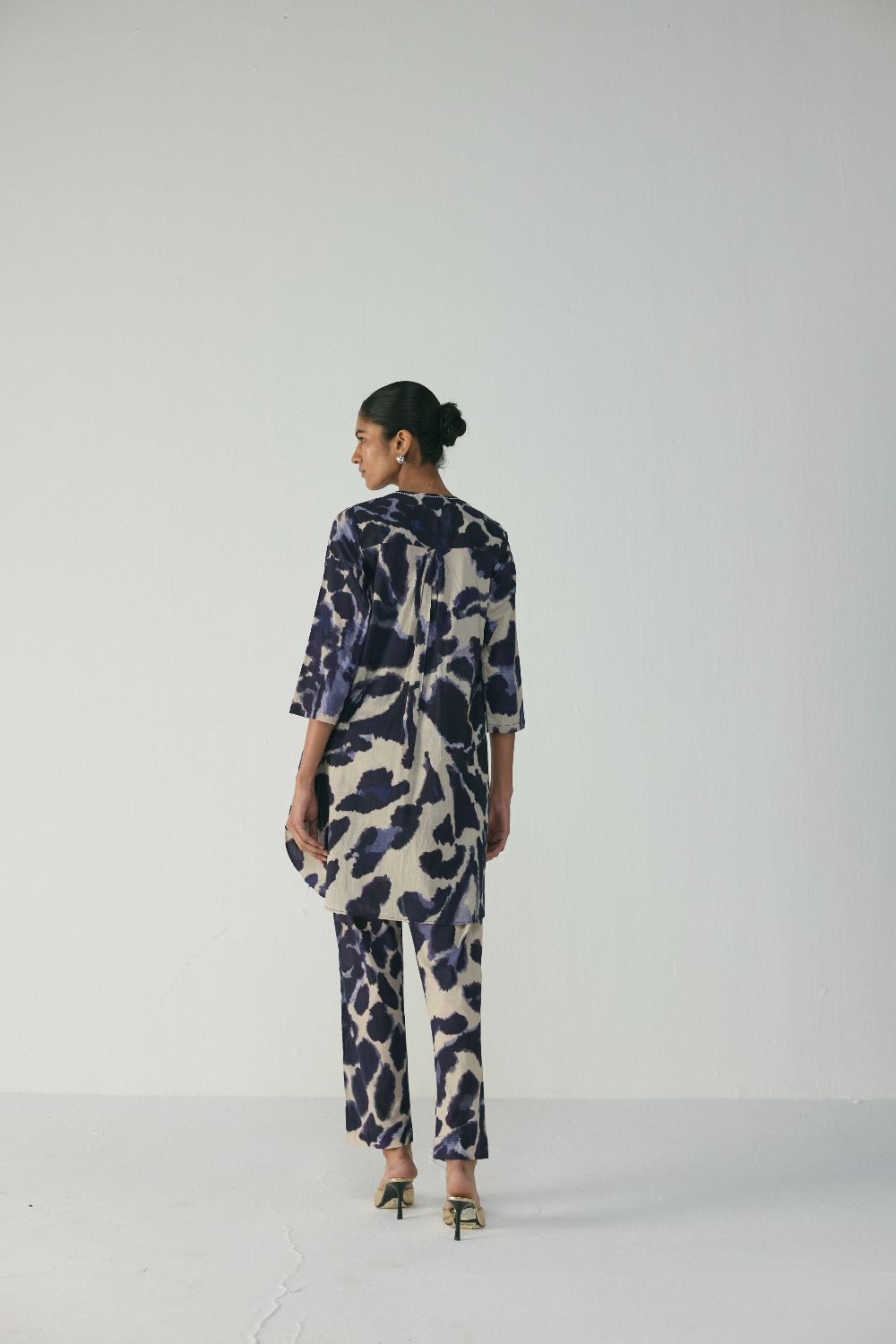 This Indigo Abstract Cotton Kurta Set is designed for comfort and versatility. Crafted in soft, breathable cotton, the set features a relaxed straight-cut kurta paired with matching trousers — both adorned with a painterly abstract print in deep indigo and ivory tones.