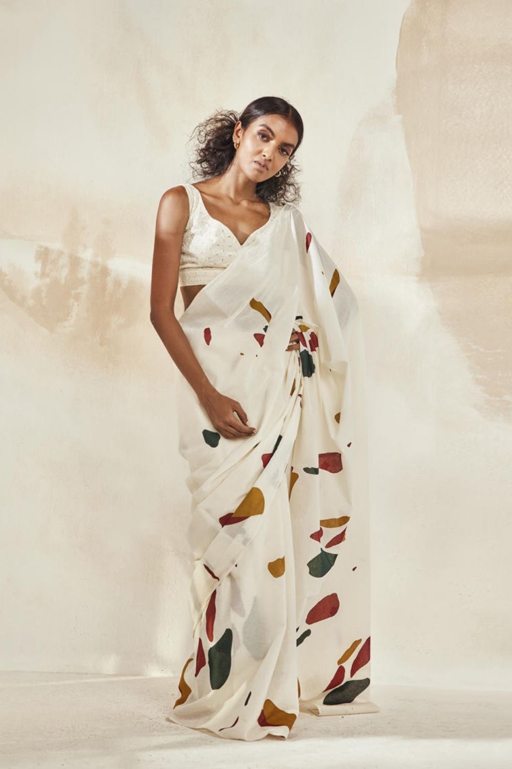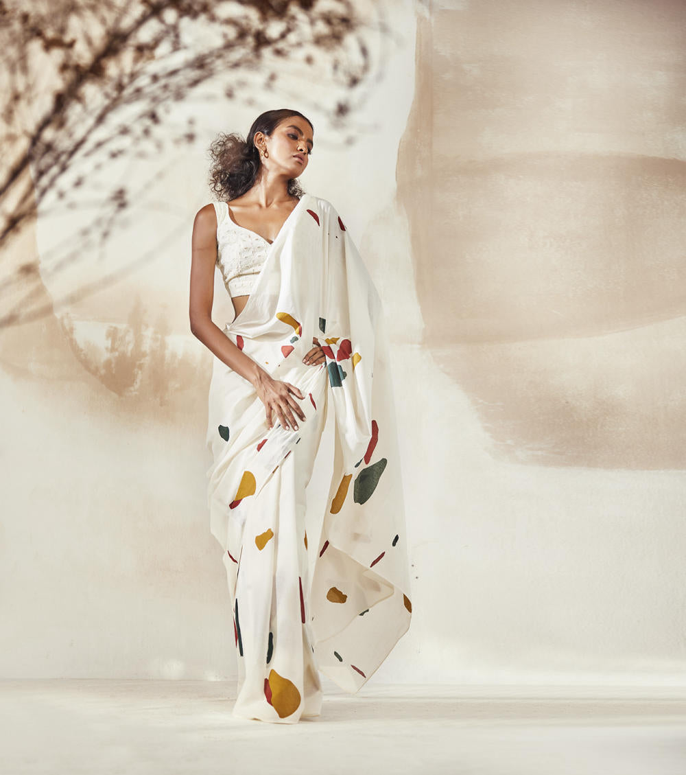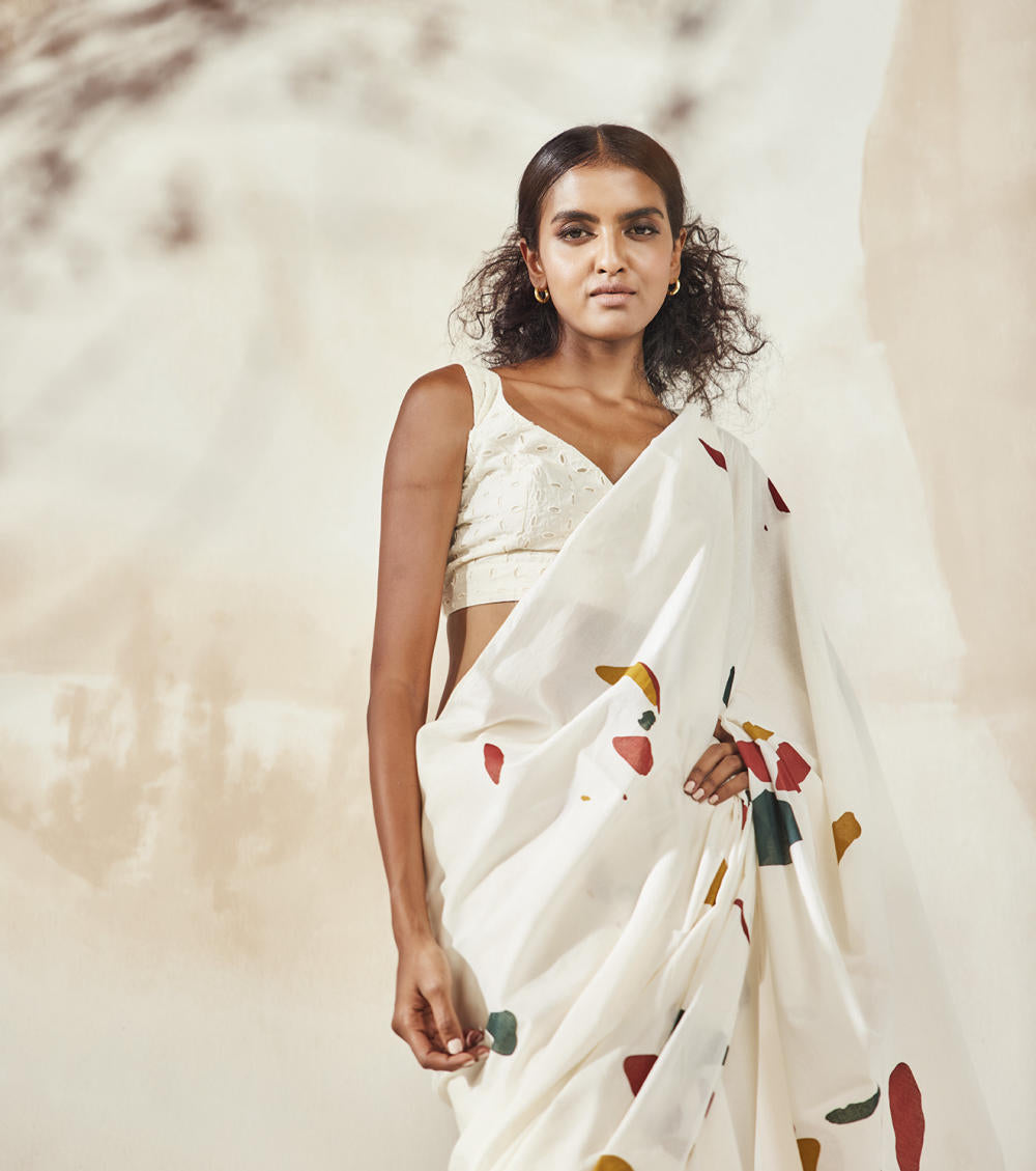 This mosaic printed saree comes with a deep neck cutwork blouse with adjustable knot closing at the back.
