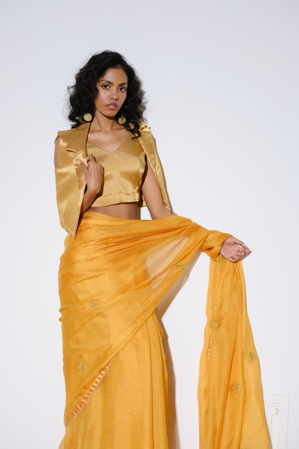 The metalic blouse and jacket is used for styling and does not come with the saree.