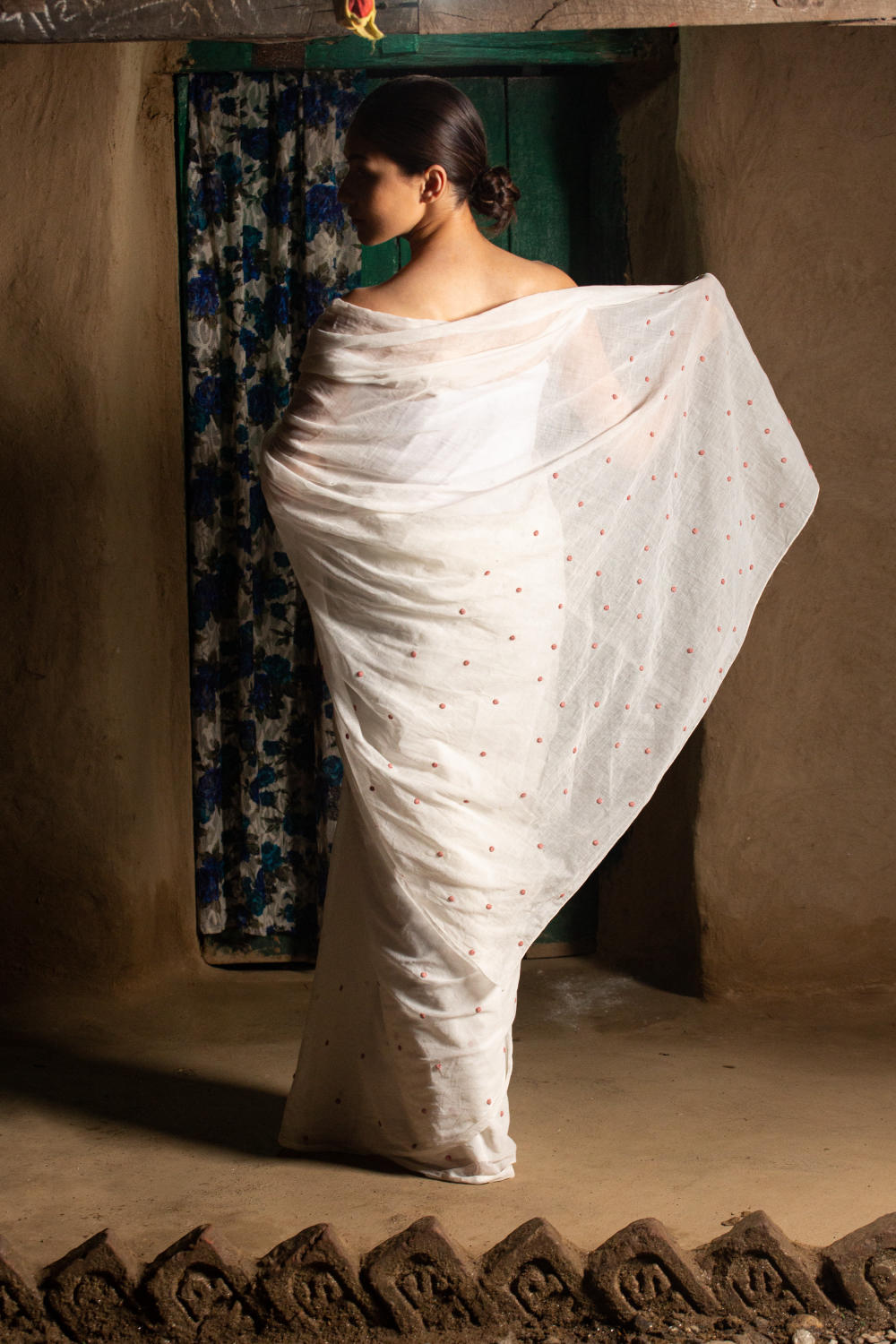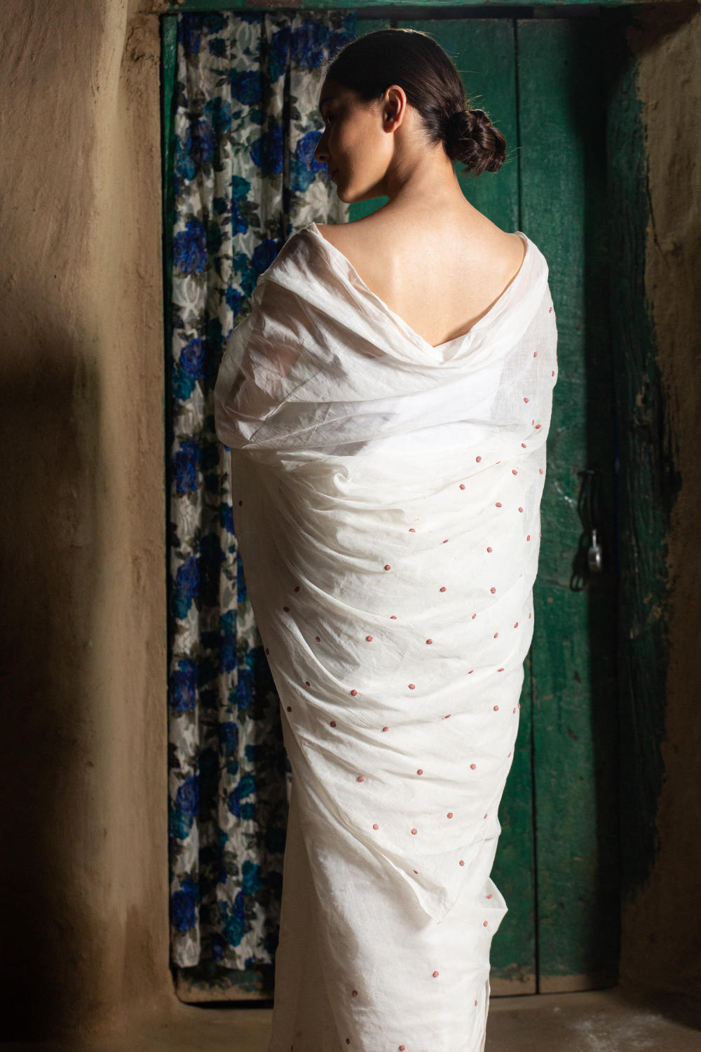 These delicate red 3D dots are sprinkled all over the Pallu and through the length of the yards. It comes with an attached blouse piece and the fabric drapes like a charm.
