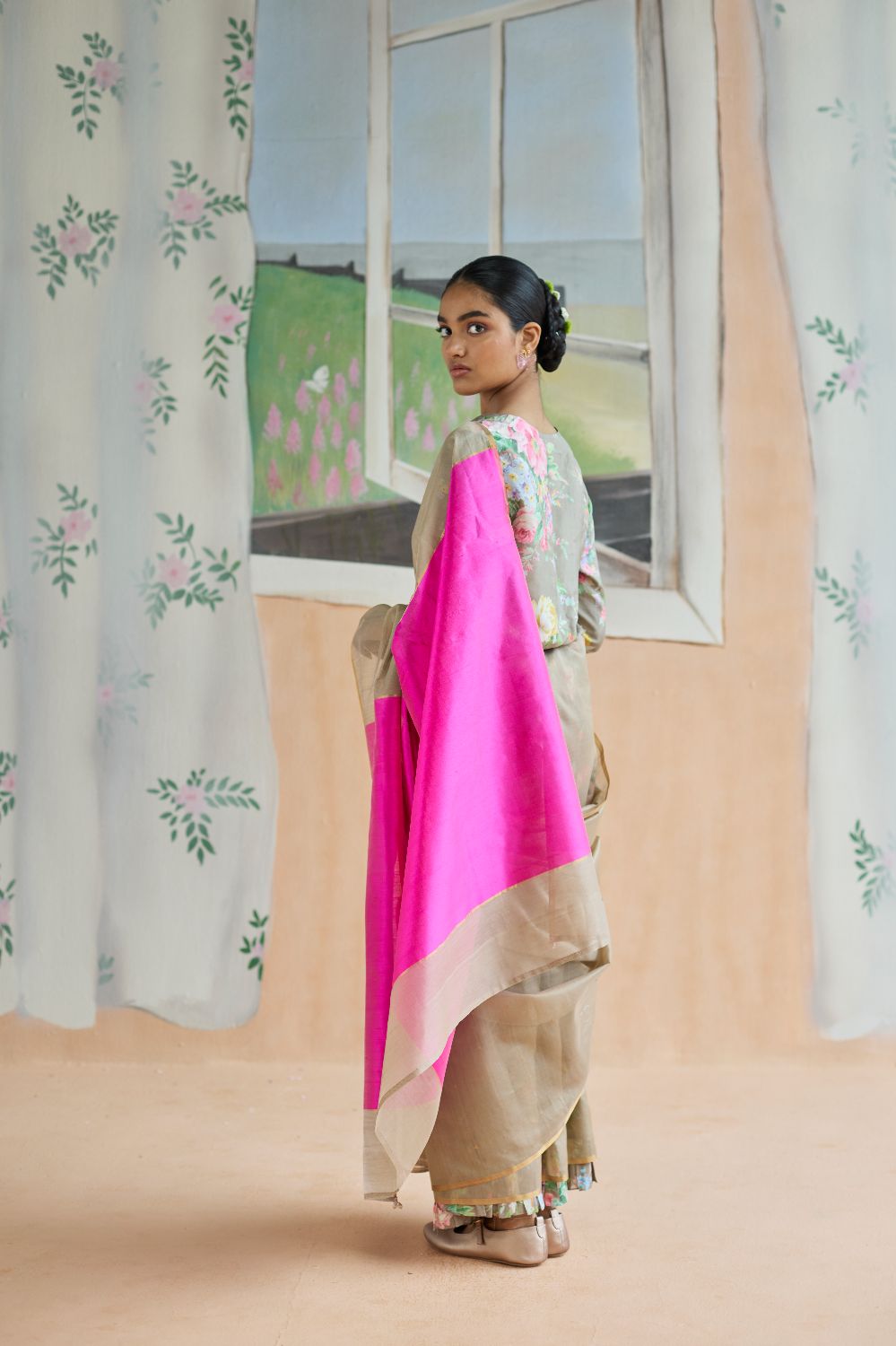 Brown and pink sari in handwoven silk-cotton chanderi is a celebration of contrast—earthy depth meets radiant clarity. The brown and pink create a color combination that feels both unexpected and effortlessly refined. The solid color is a study in quiet sophistication. But what truly sets this look apart is the styling narrative: paired with a printed blouse piece and matching underskirt that peaks through, revealing a striking duality. It’s a play of texture, contrast, and layering—a modern interpretation of traditional fabric that balances restraint with expressive detail. The drape offers a graceful fluidity—perfect for moments that call for elegance without excess, making it perfect for brunches or a formal evening.