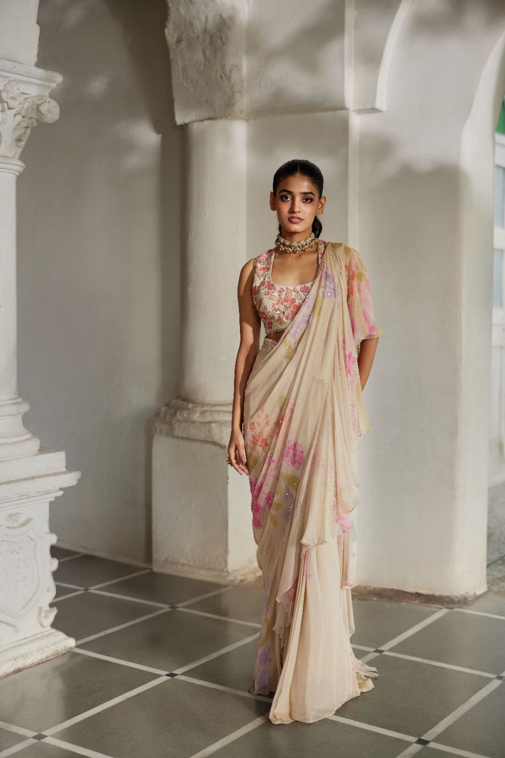 Every collection begins long before the garment is stitched: months of research into India’s rich craft traditions, followed by the painstaking creation of detailed illustrations. These artworks are then scanned, enhanced with jewel-toned palettes and touches of rich gold, and finally translated onto fabric. The result is a visual language so distinct that their name has become synonymous with print, colour, and the kind of glamour that still feels feather-light.