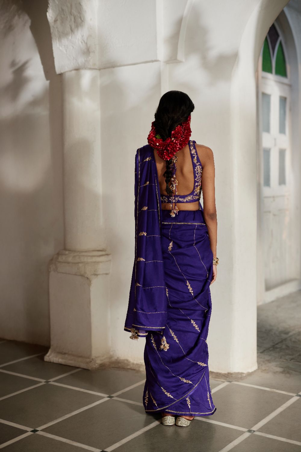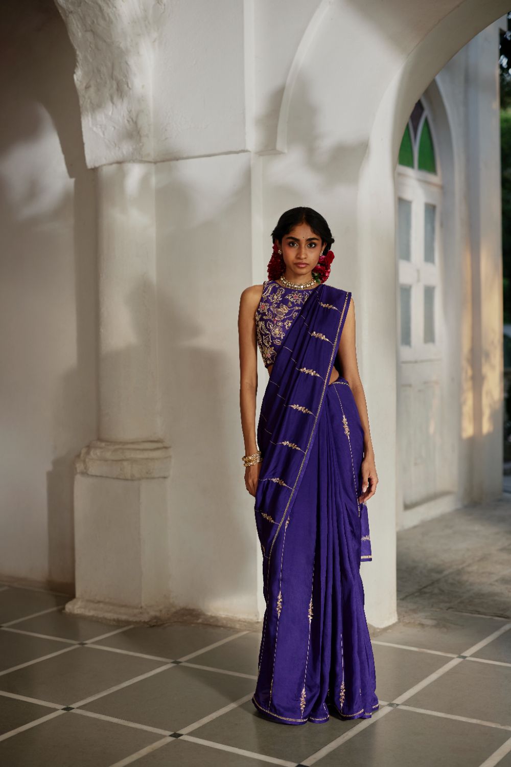 A solid purple saree adorned with exquisite hand-embroidered lines and delicate floral accents. Paired with a matching blouse fully embellished with aari and zardozi embroidery, and finished with elegant hand-tucked tassel details for a sophisticated, artisanal look.