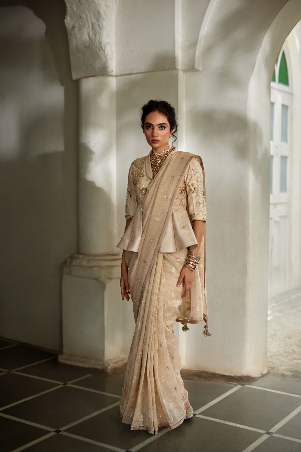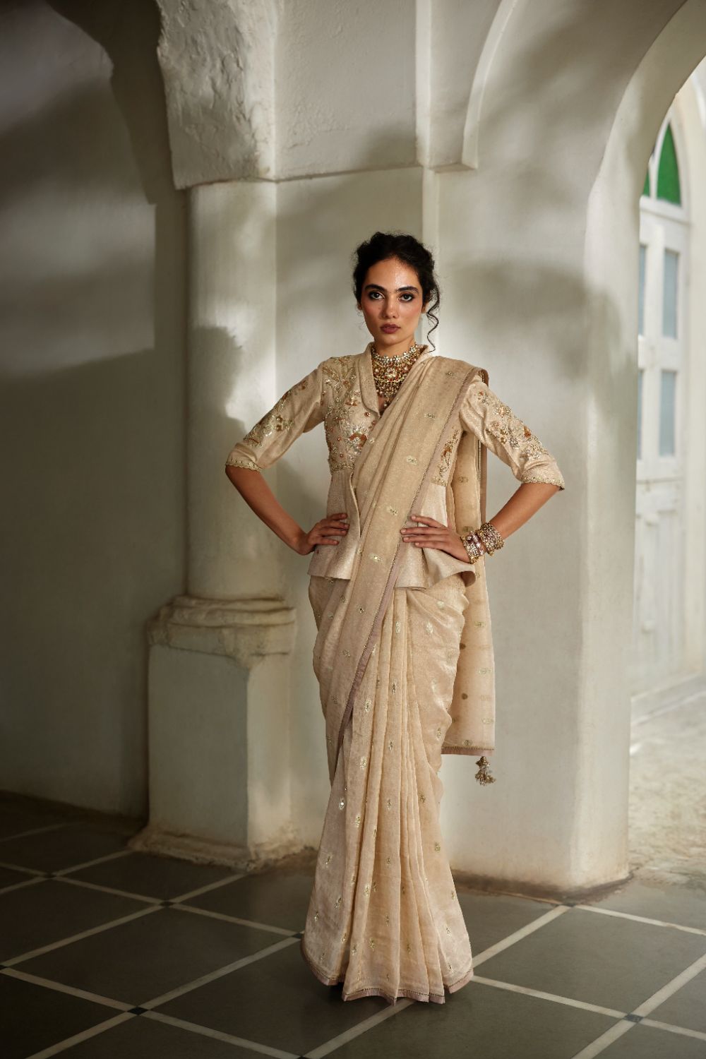 A stunning peplum saree set featuring an intricately hand-embroidered peplum paired with a soft, elegant tissue saree adorned with woven butis. The saree drapes gracefully and is finished with a delicate ladder lace edge, blending traditional craftsmanship with contemporary style.
