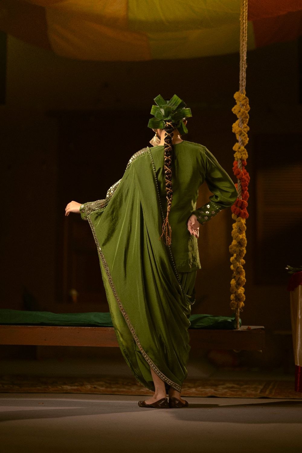 Step into effortless elegance with this relaxed-fit top, adorned with vegan light gold leather appliqué and a graceful toga drape. The structured top, featuring side slits, pairs perfectly with the elasticated dhoti skirt to create a chic, contemporary silhouette ideal for weddings, festive occasions, and modern celebrations. Model is wearing size S