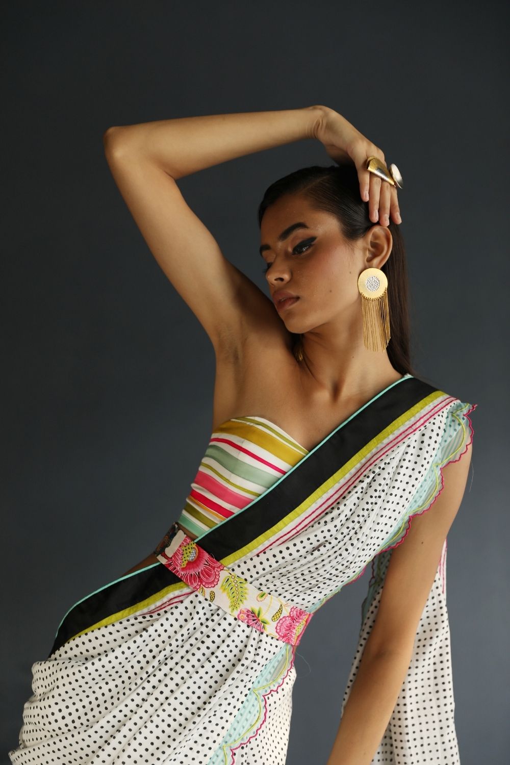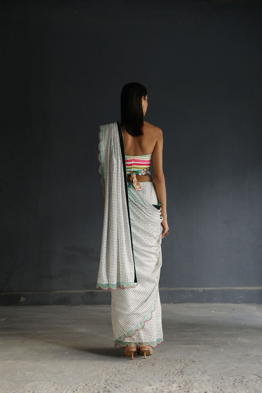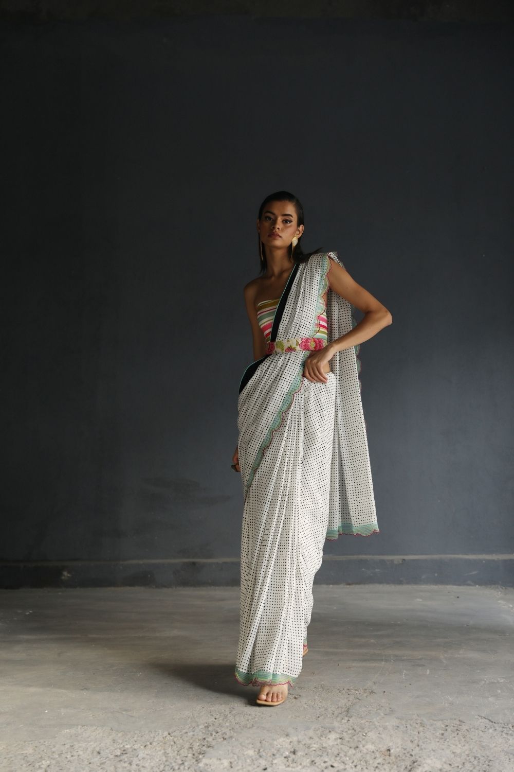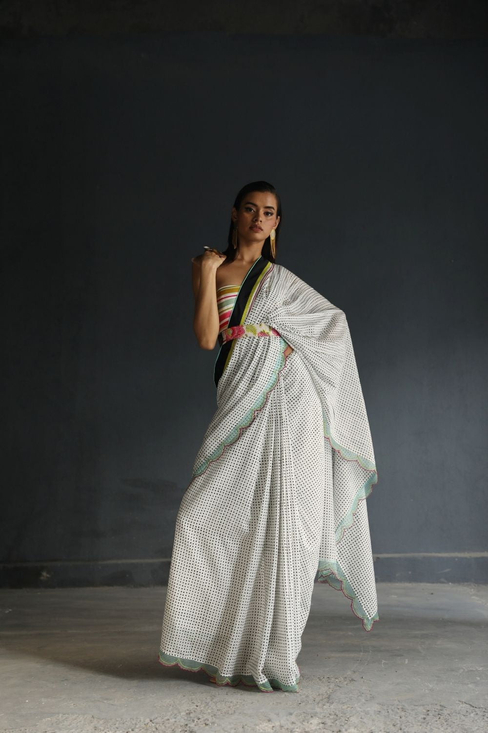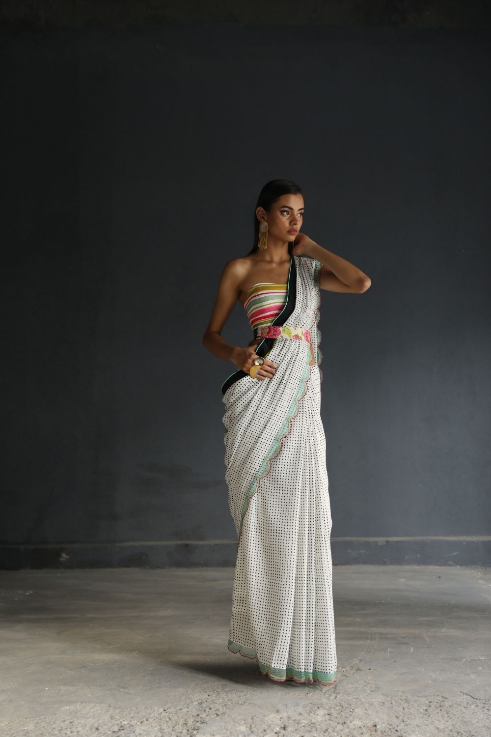 Black and White cotton silk Saree with organza panel scalloped hem and silk finishings paired with multicoloured bustier and belt.