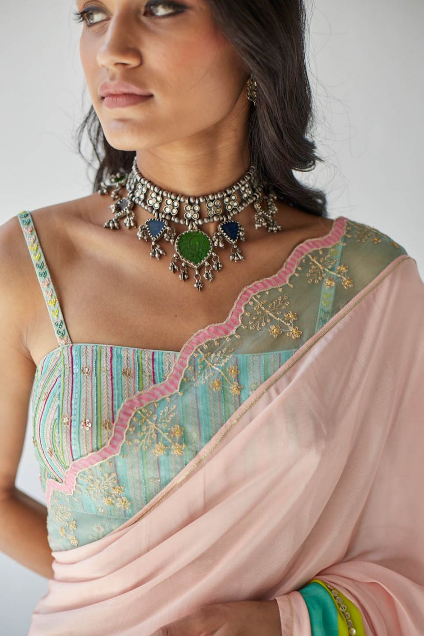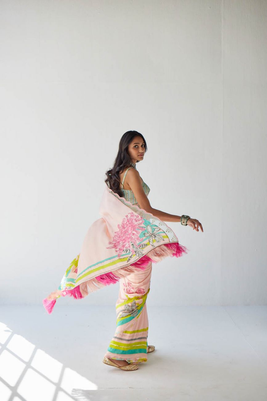 Nude pink printed hand embroidered sari with fringe detailing . Along with hand embroidered powder blue blouse piece.