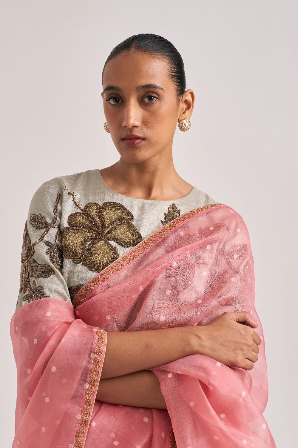 A Pink Polka Handwoven Organza Jacquard Silk Sari Detailed With A Bead Hand Embroidered Border.