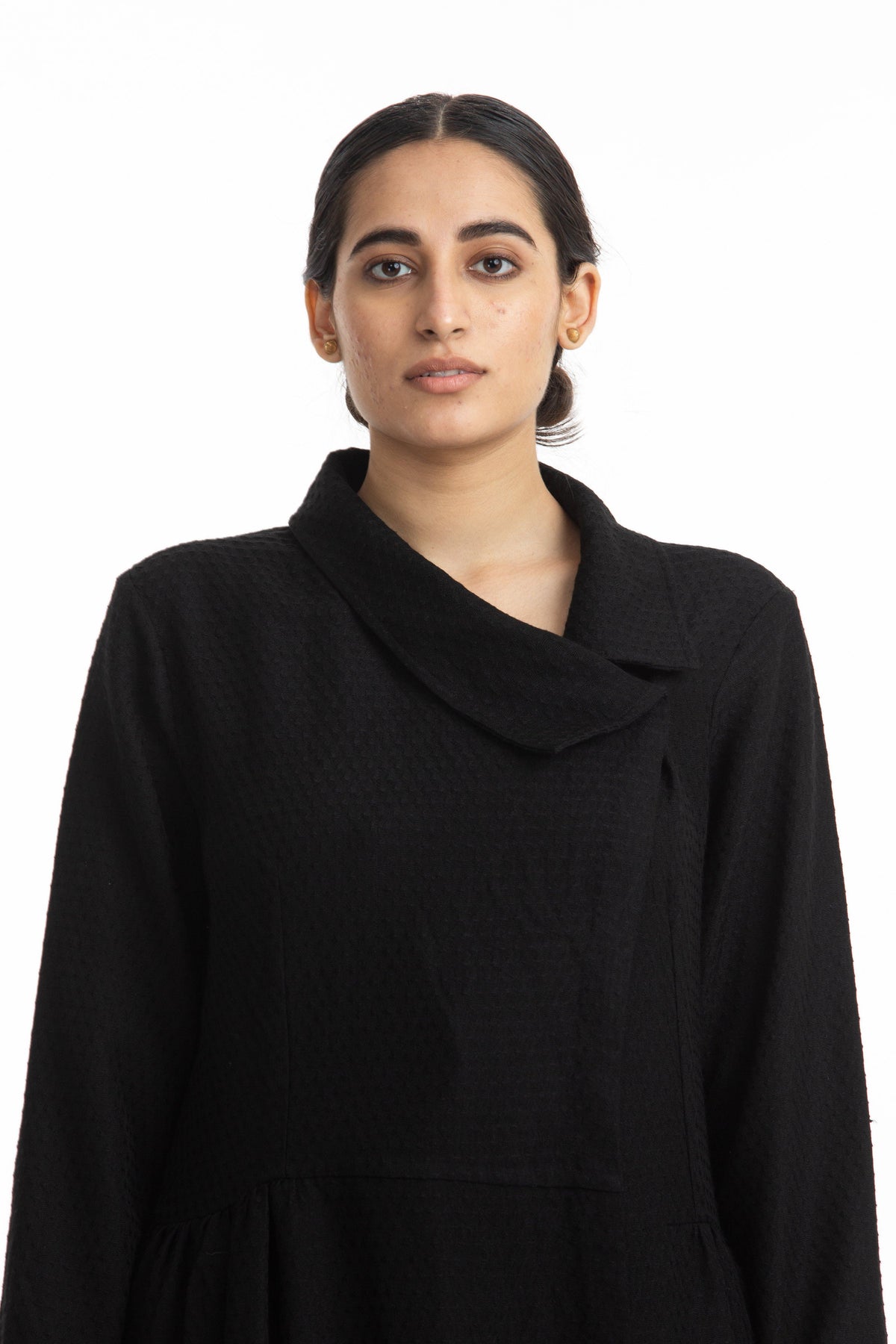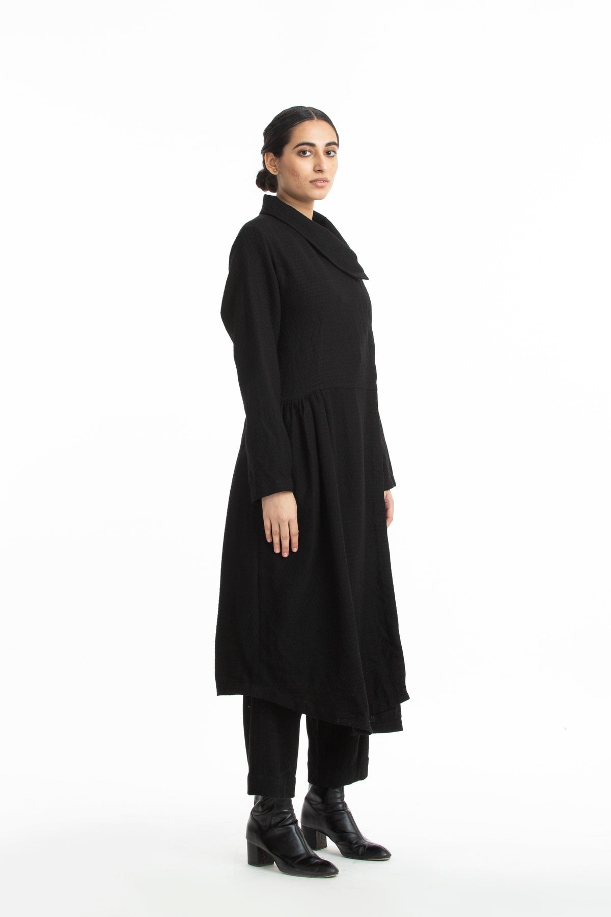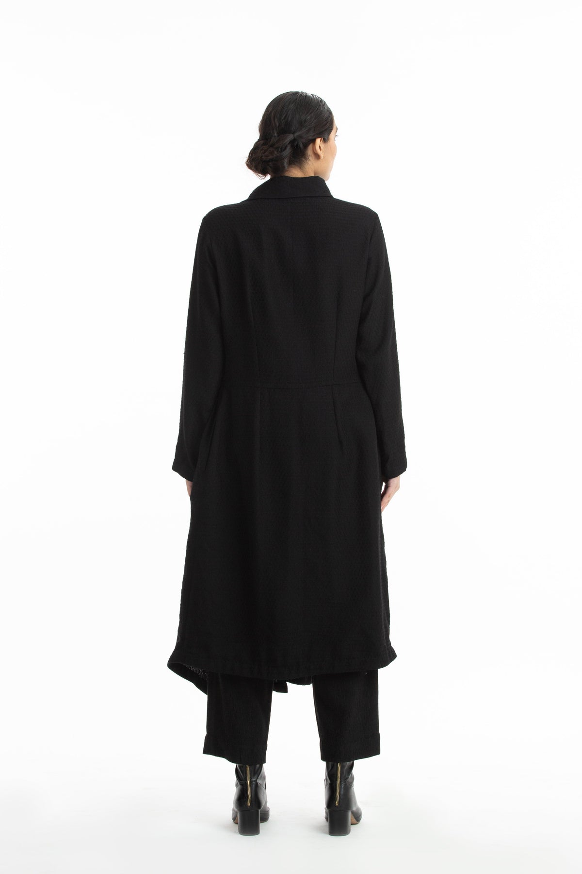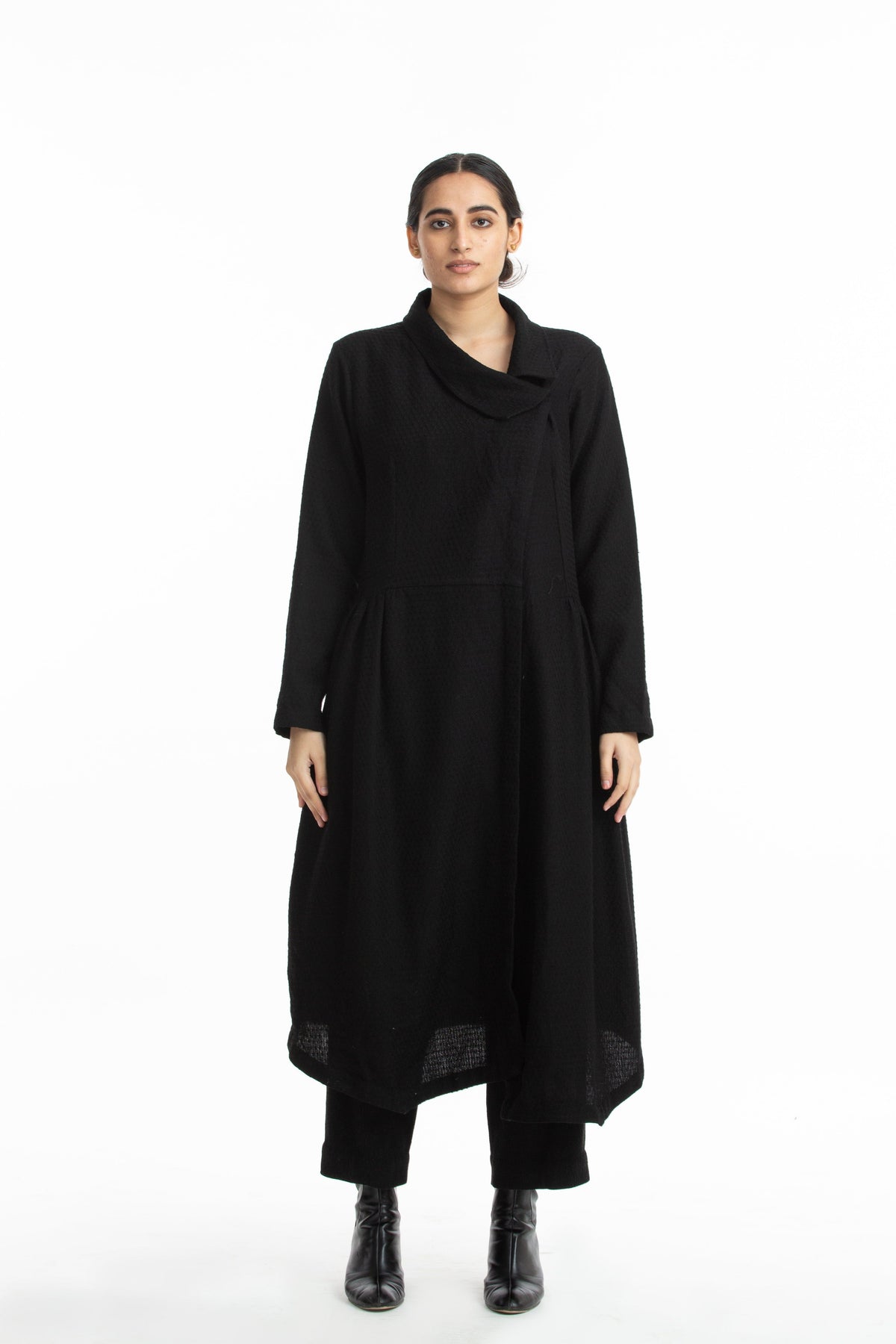 "Handwoven in merino wool , this coat makes for a warm & luxurious winter wear.