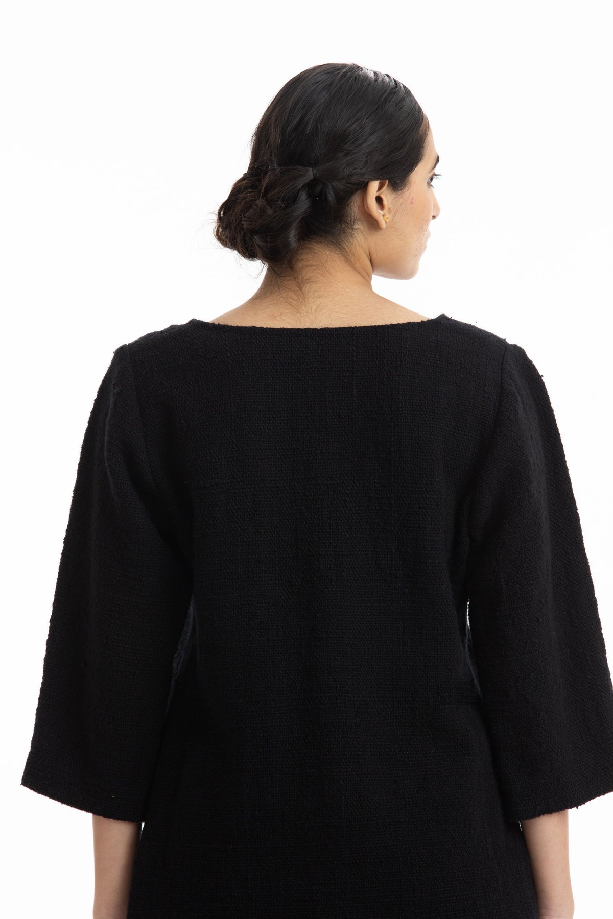 Handwoven in handspun cotton , this top makes for a structured and comfortable silhouette. It can be dressed up or down making this top a wardrobe essential. The textile is designed & developed on a traditional