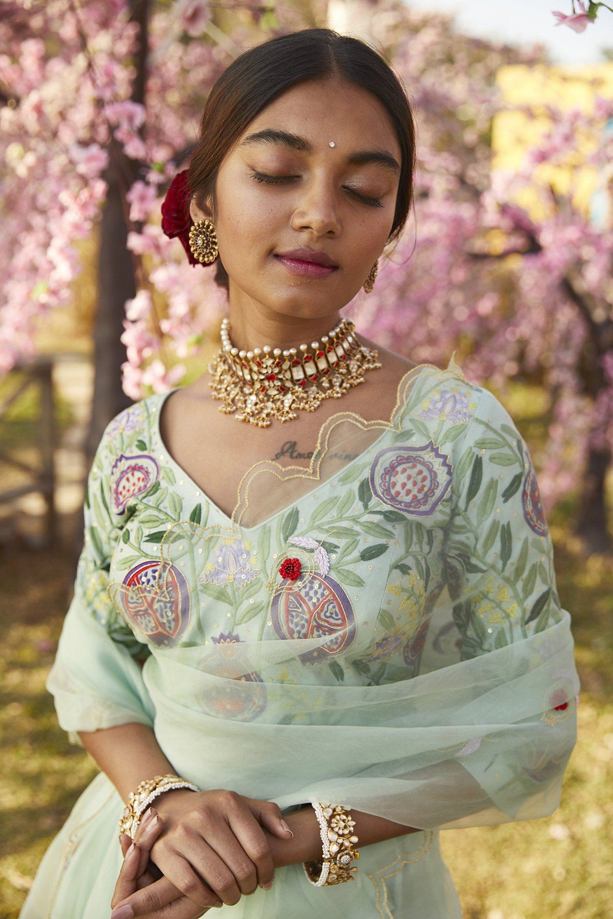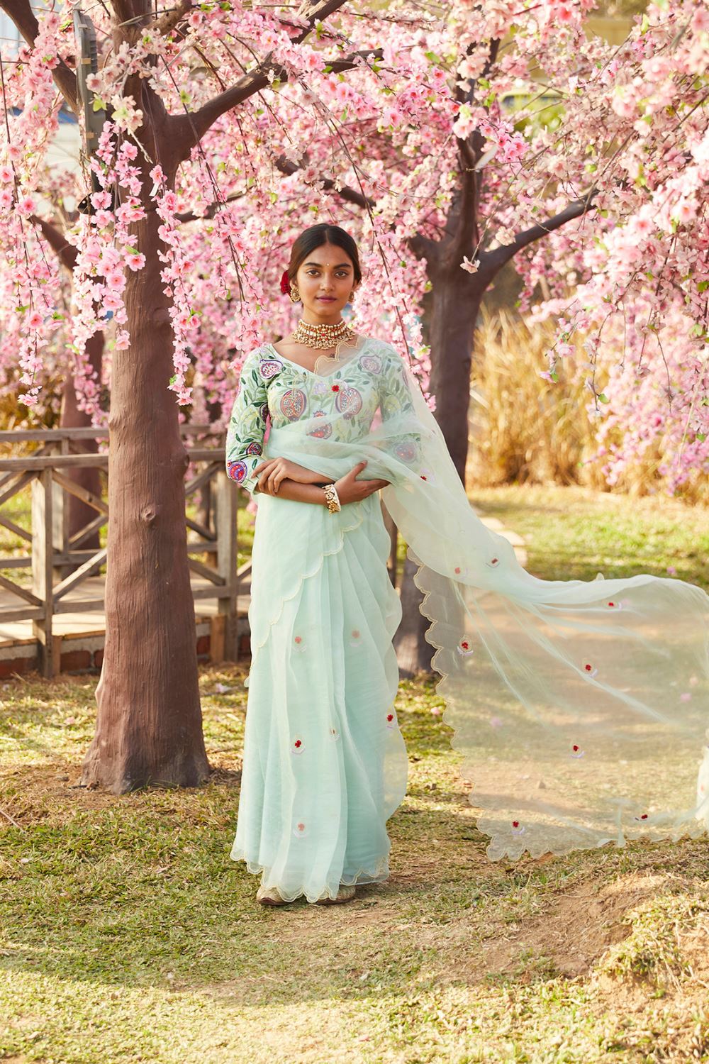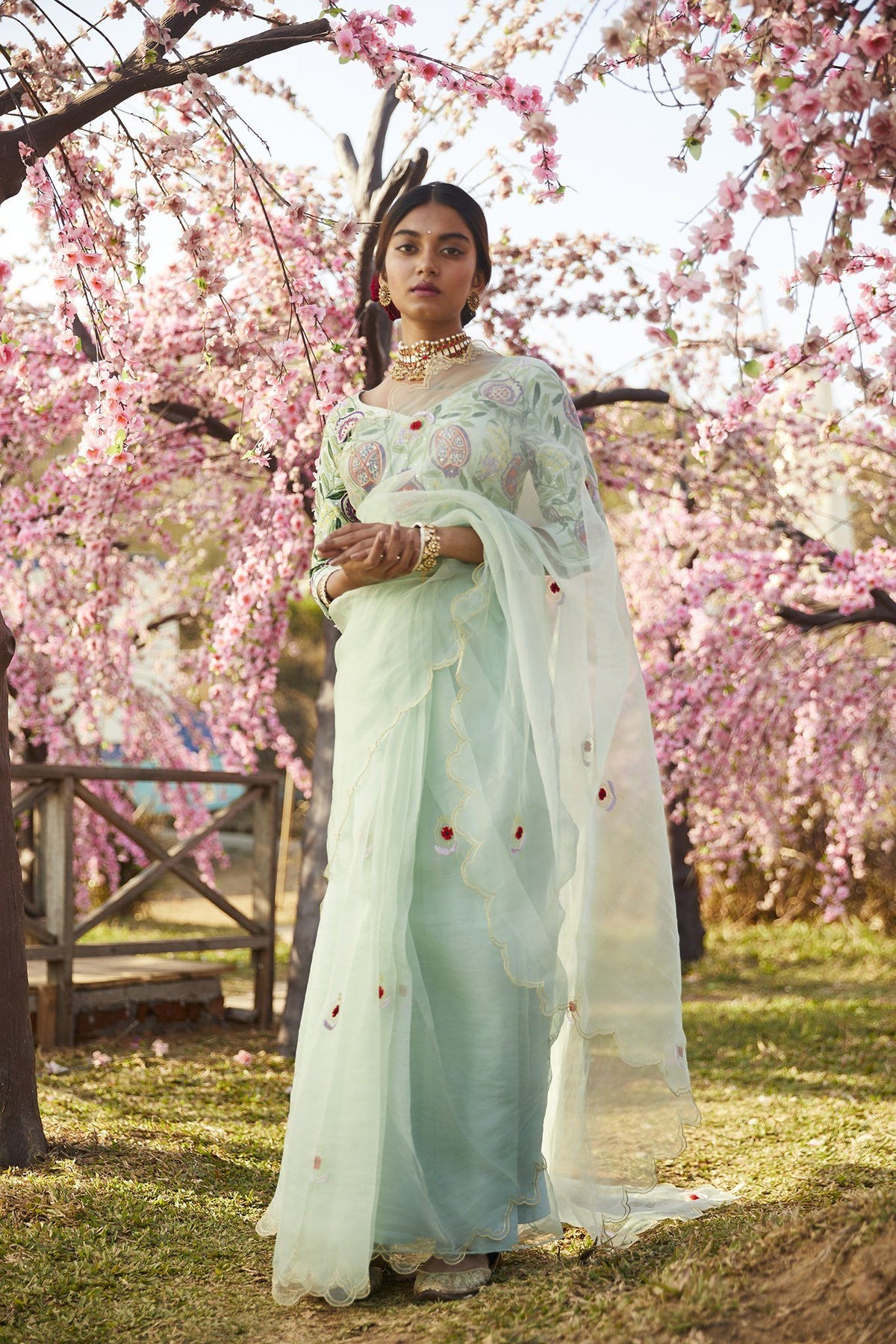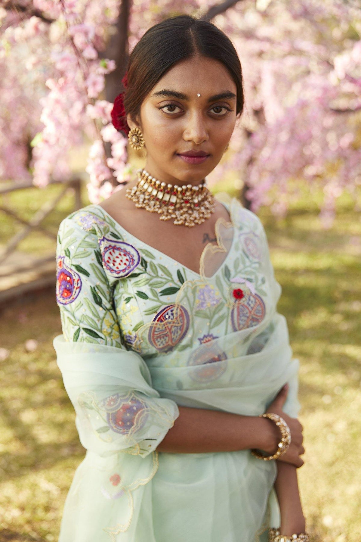 Wispy, dreamy, and delicate, our sheer organza silk sari is reminiscent of Maharani Gayatri's elegant style. It features hand-embroidered anar motifs and scallop details along the length of the sari and comes with a matching sari petticoat. Complement it with our vibrant ANAR blouse.