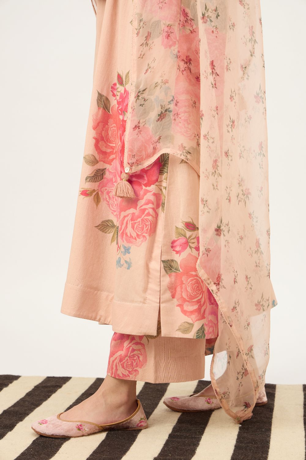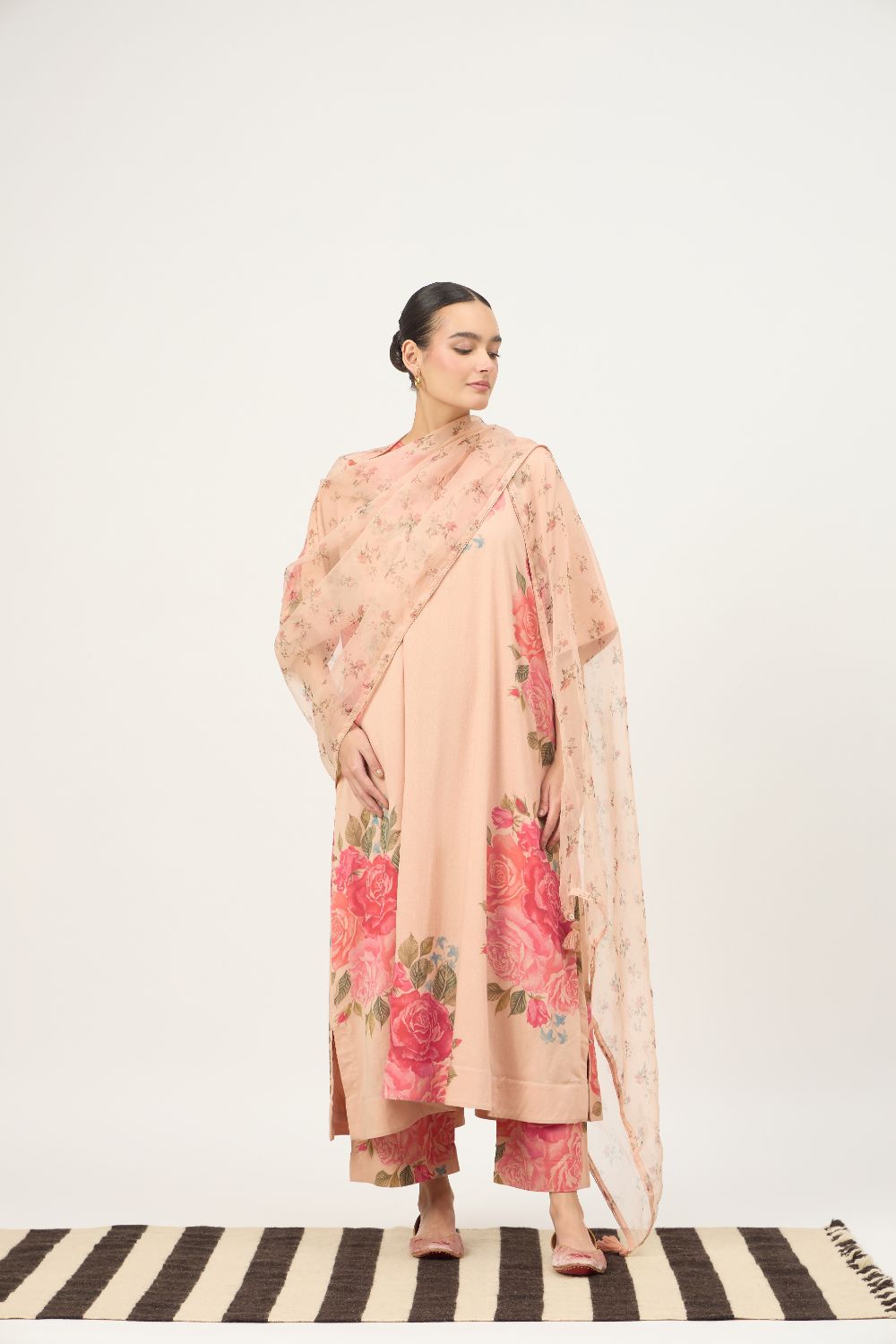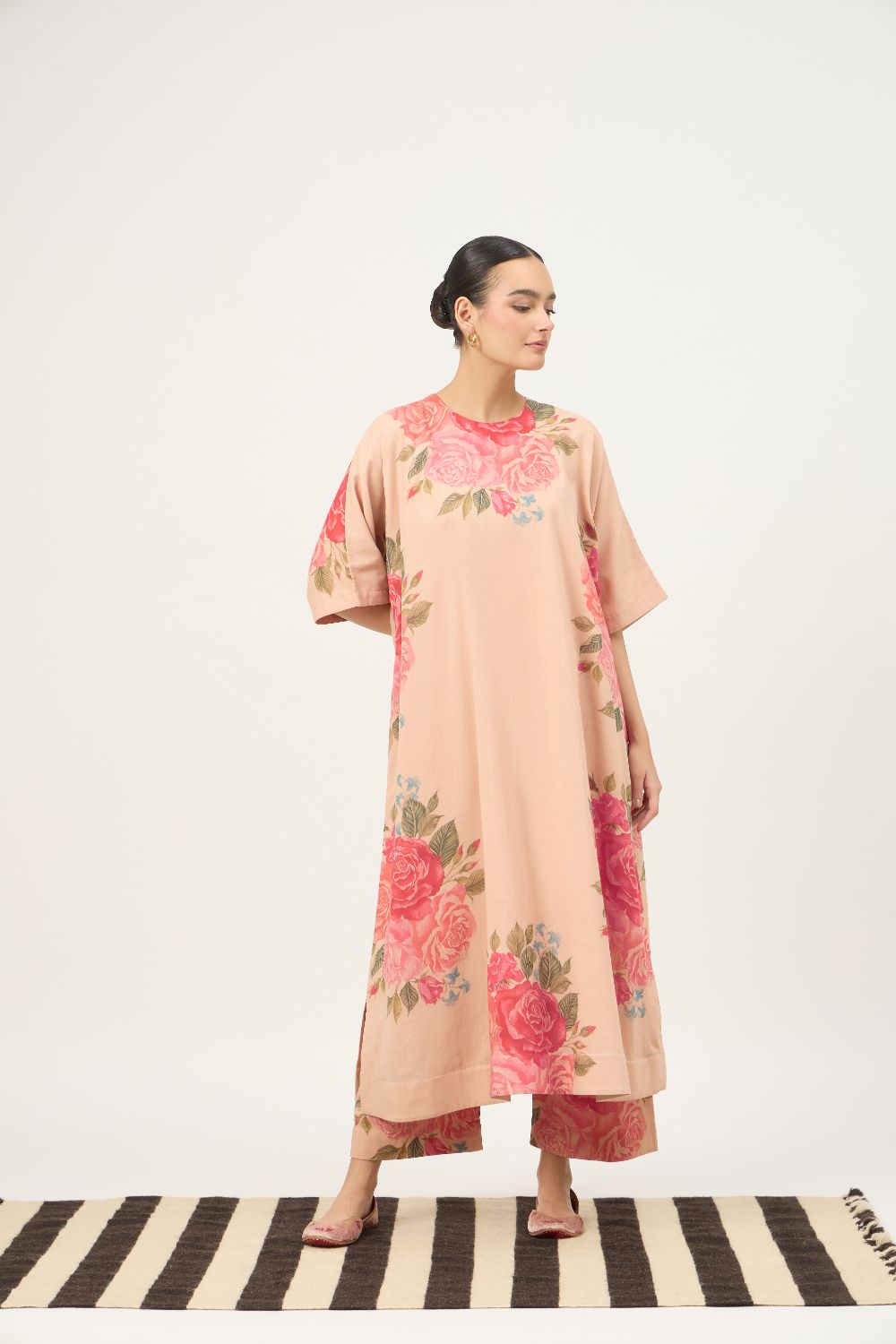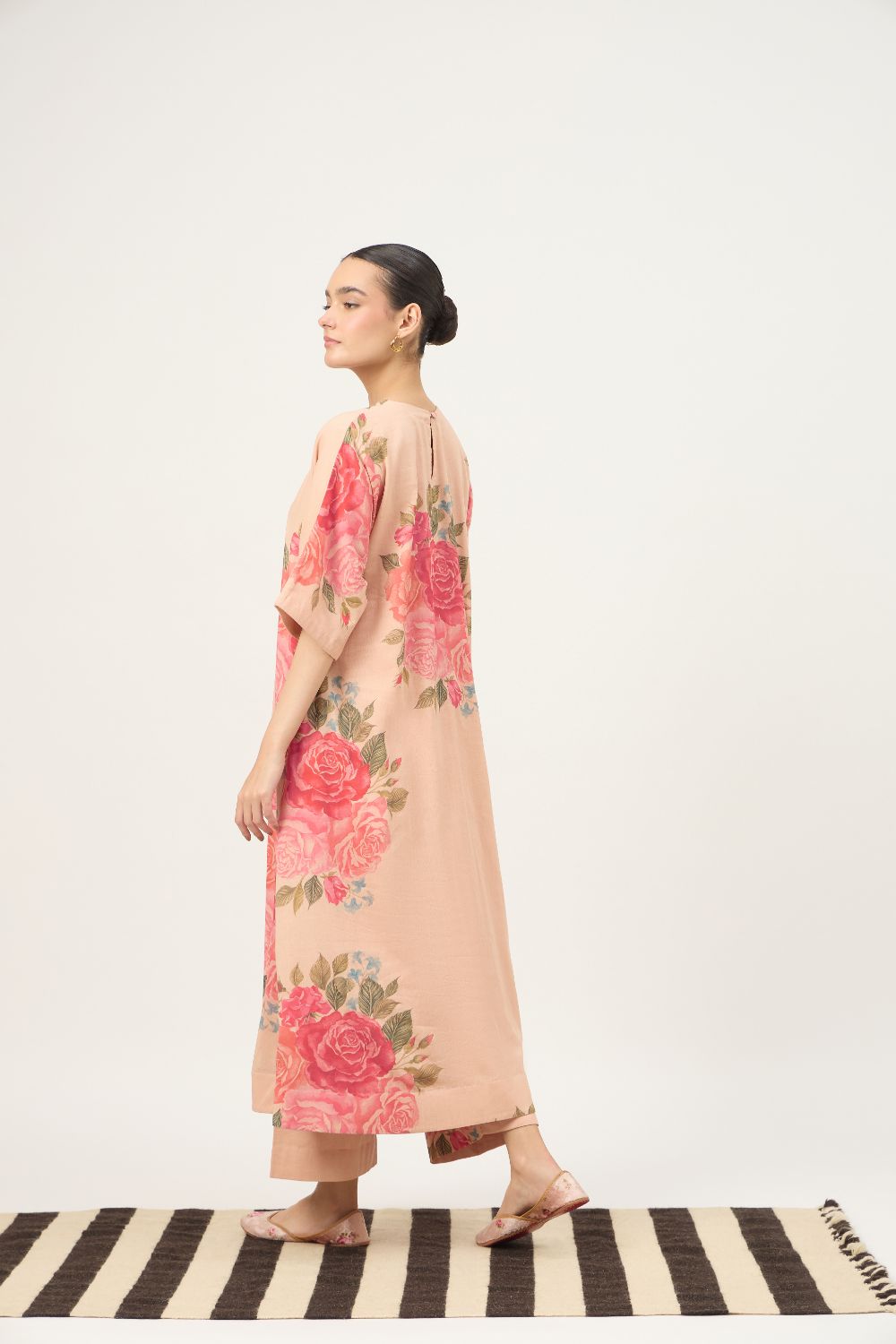 Effortlessly elegant and supremely comfortable, this pure cotton kaftan is designed for relaxed, everyday luxury. Crafted in breathable cotton, it features a soft peach base adorned with delicate floral prints that add a fresh, feminine charm. The easy kaftan silhouette offers a loose, flowy fit that drapes beautifully on all body types, making it ideal for warm weather.