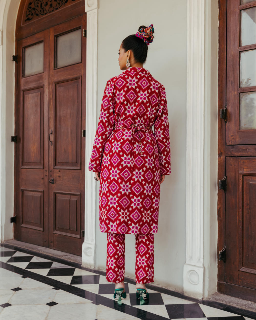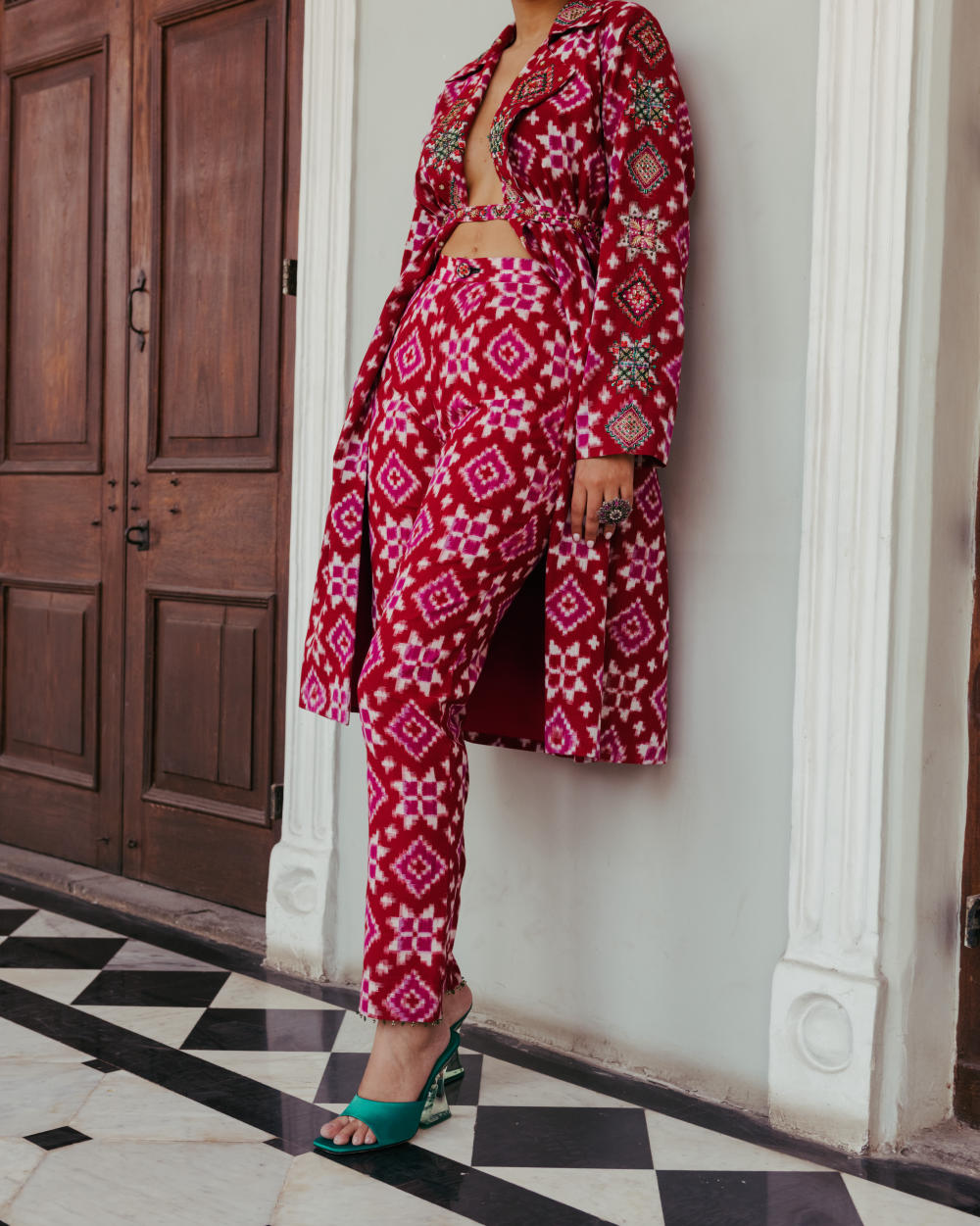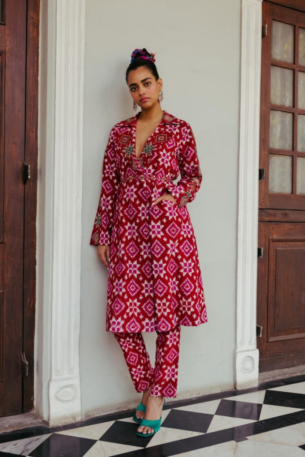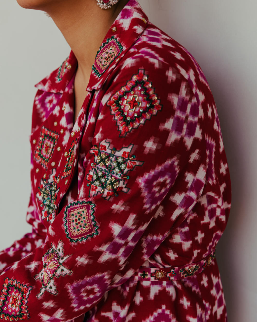Crafted from rich cotton silk Ikat, this kurta set is a charming representation of the modern-day 'Poetry of the loom'. It features form and structure but will also help you channel your inner feminine and comes with a hand-embroidered belt to cinch the waist. Skillfully embellished lapels and sleeves prove true to be the point of focus. Pair it up with our matching tailored cropped trousers to complete the look