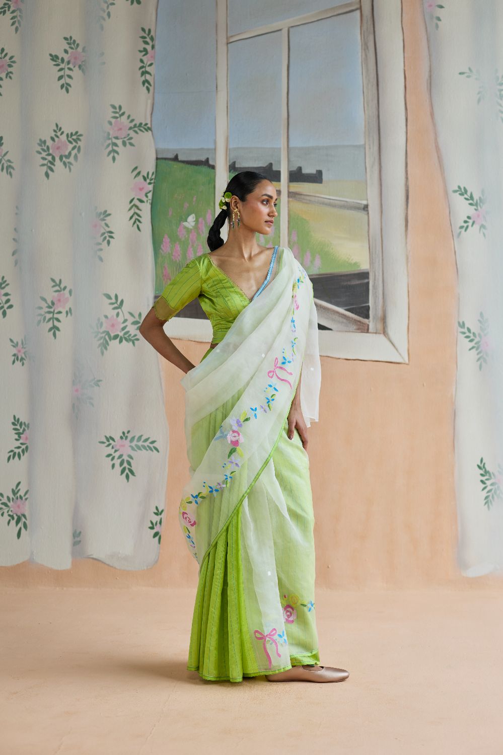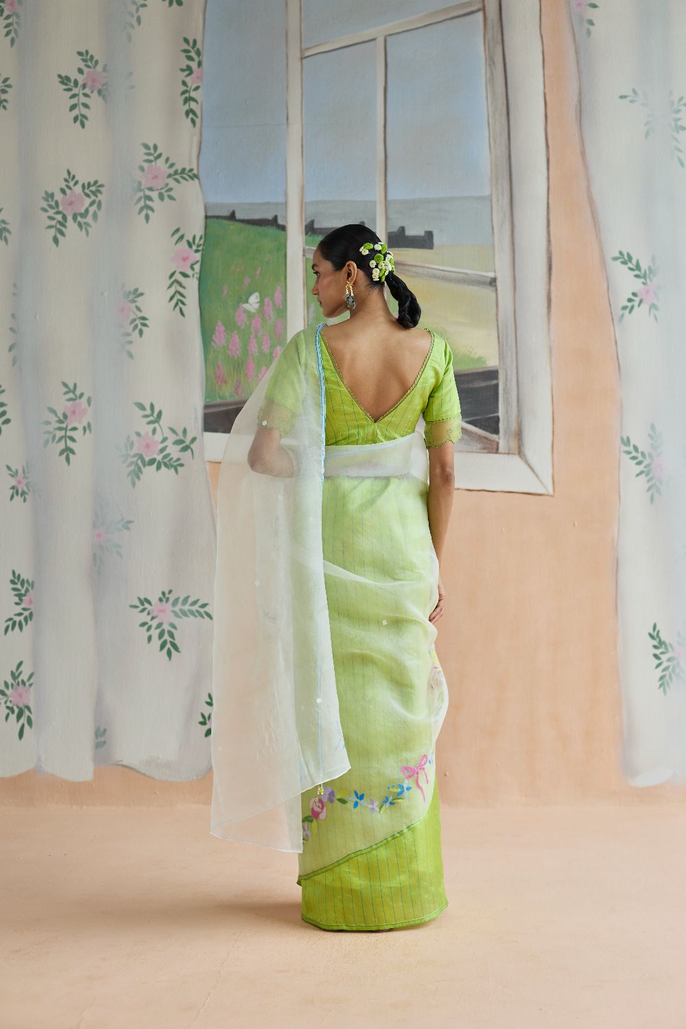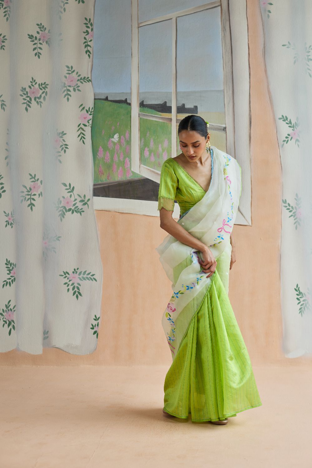 The exclusive half off-white, half green jamdani sari in handwoven silk and organza is a duality of grace and presence that creates a visual balance between restraint and sophistication. Each piece is one-of-a-kind and meticulously crafted over weeks, weaving motifs into works of art by master artisans. This sari creates an ethereal texture — feather-light, sheer, and luminous with motifs that appear to float on the surface. This is an epitome of elegance and heritage in your wardrobe.
