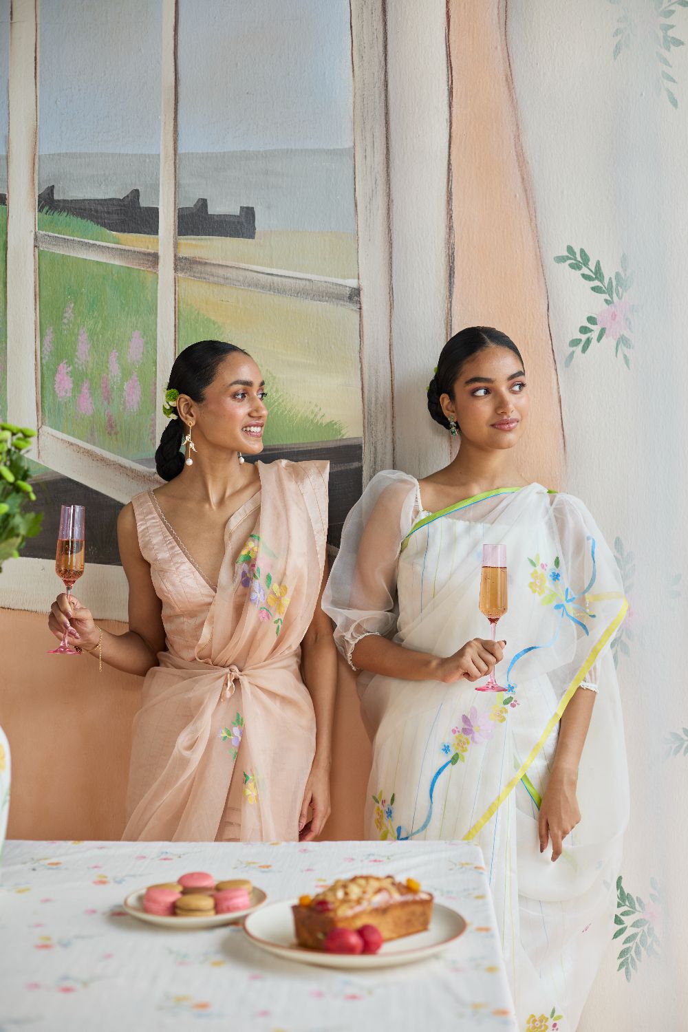Founded by Megha Kanera, a graduate of NIFT, Nadiya Paar creates clothing and saris that feel like poetry in motion. Their world is built on handwoven linen, handspun cotton, and mulberry silk, shaped through heritage techniques of handloom weaving and hand-stitching. Every silhouette feels effortless — fluid, breathable, and timeless — the kind you want to live in, not merely wear.
