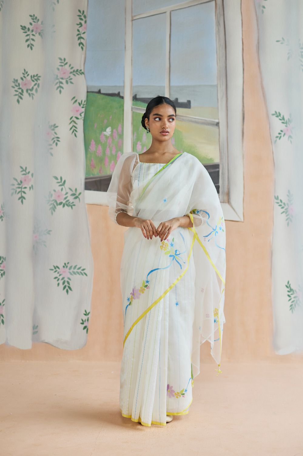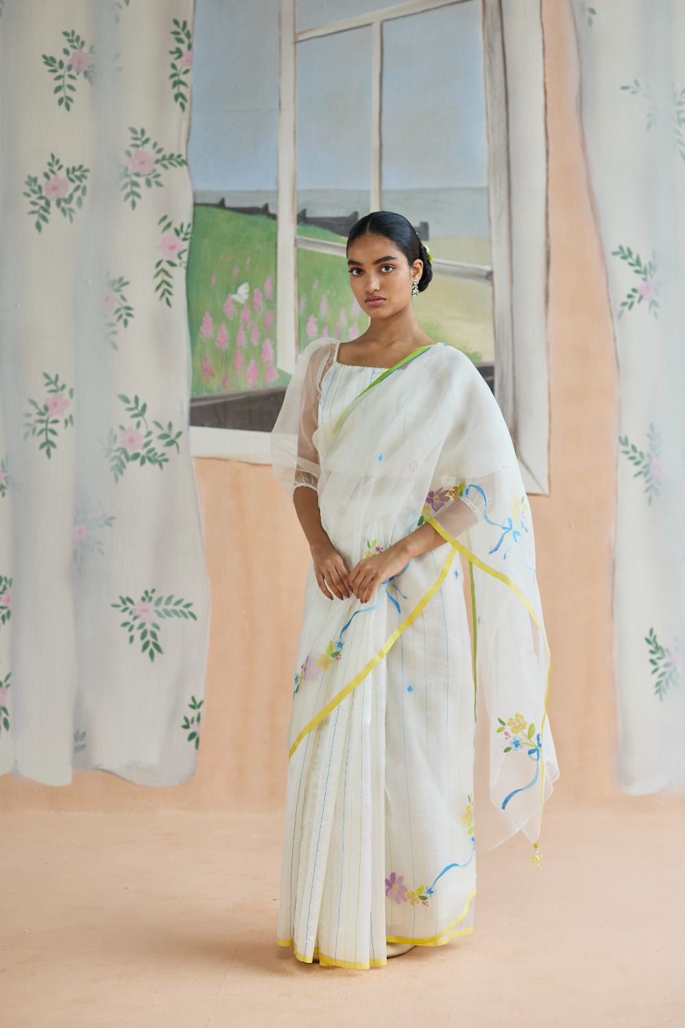 Handwoven silk and organza. Beaded tassels. Comes with running blouse piece in handwoven mulberry silk.