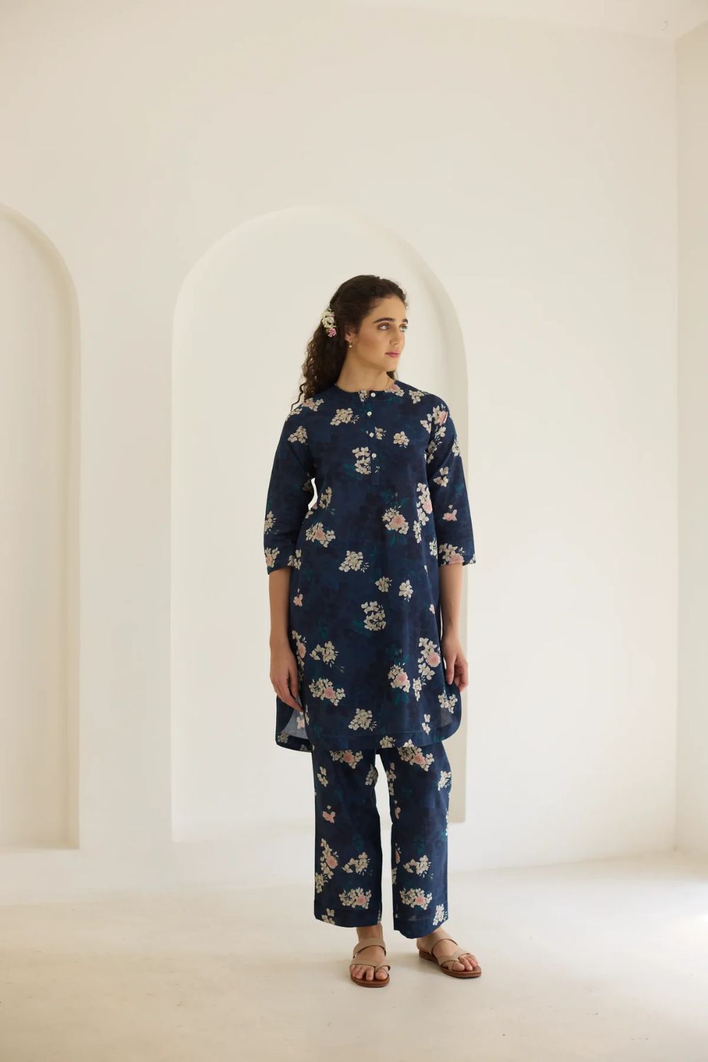 Model is 5 feet 9 inches tall and wearing a size small. Kurta Length 35 inches. Pant Length 36 inches.