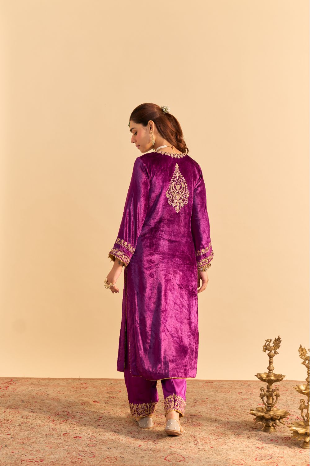 This kurta set is from our Velvet Collection. It features a long velvet kurta paired with a silk salwar and crafted with three-quarter sleeves. The kurta has a zero neck with a slit and is embellished with kirandori embroidery done in aari, highlighted with pearls. The salwar is finished with an embroidered border.