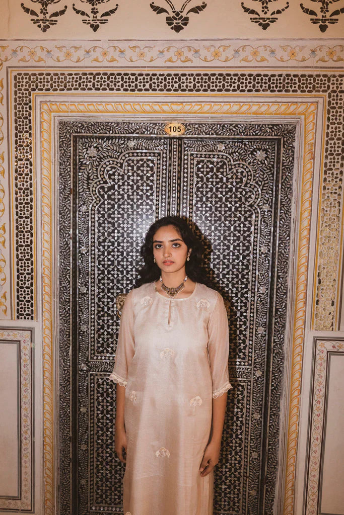 This set of 3 includes a hand spun Kota silk dupatta in chandaniya colour embroidered with gulmohar petal inspired motifs in pain gold zari thread. It is embroidered by our in-house embroiders. The kurta is also in Kota silk fabric & is embroidered with a floral motif inspired by the gulmohar flower. The motif is embroidered in Resham threads and offset lille pearls. the kurta comes attached with a cotton mul lining. The sleeves have a beautiful monotone scallop thread lace made by our in-house artisans. The outfit is offset with narrow pants with a jaali and thread detailing on the bottom hem. All of our Kota silk is directly sourced by us from the weavers.