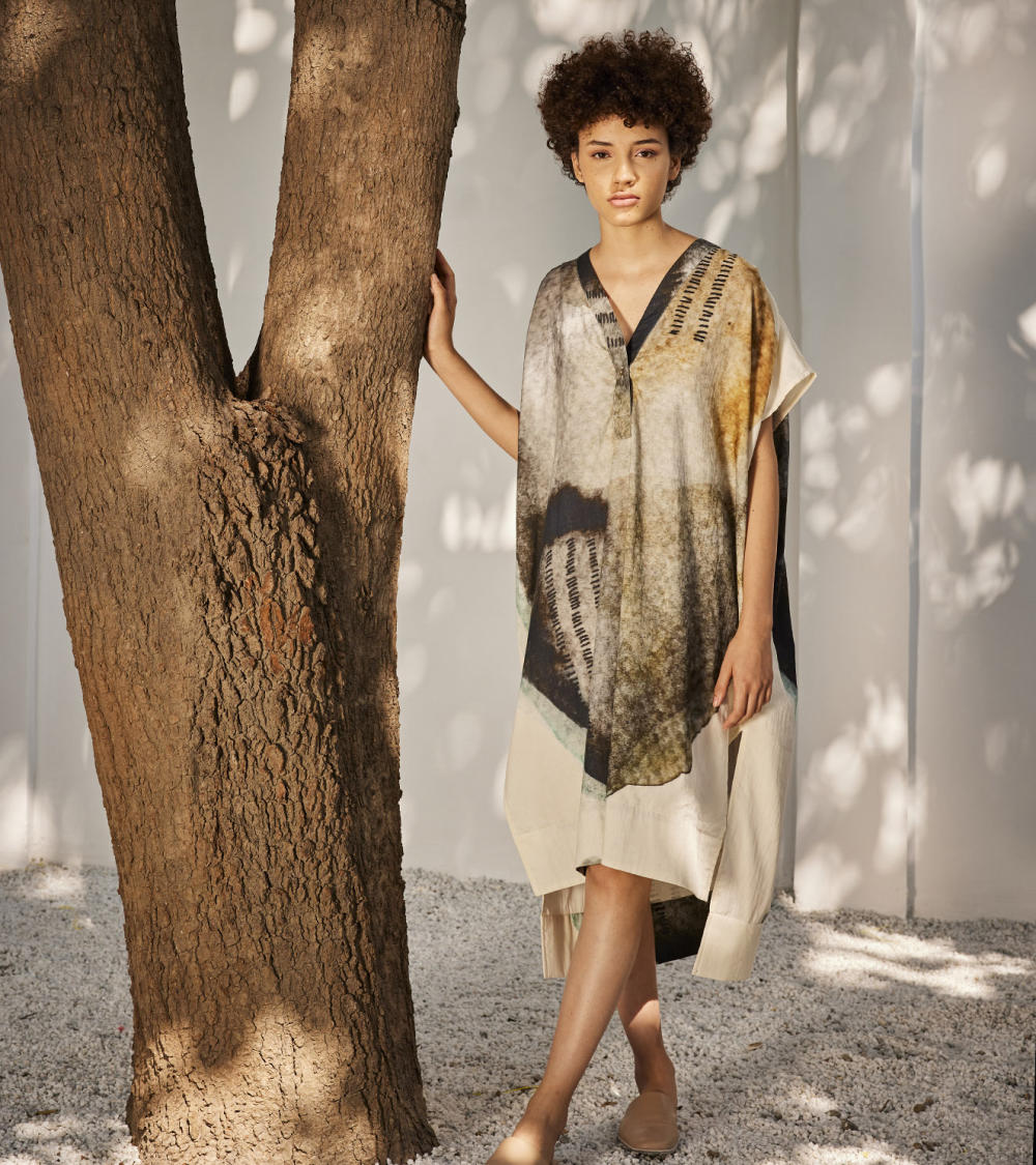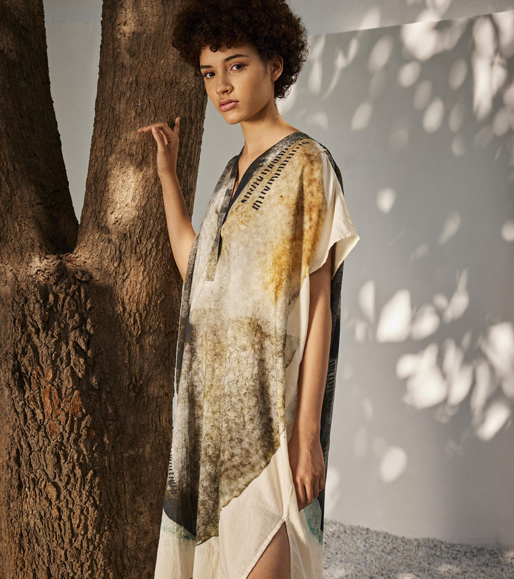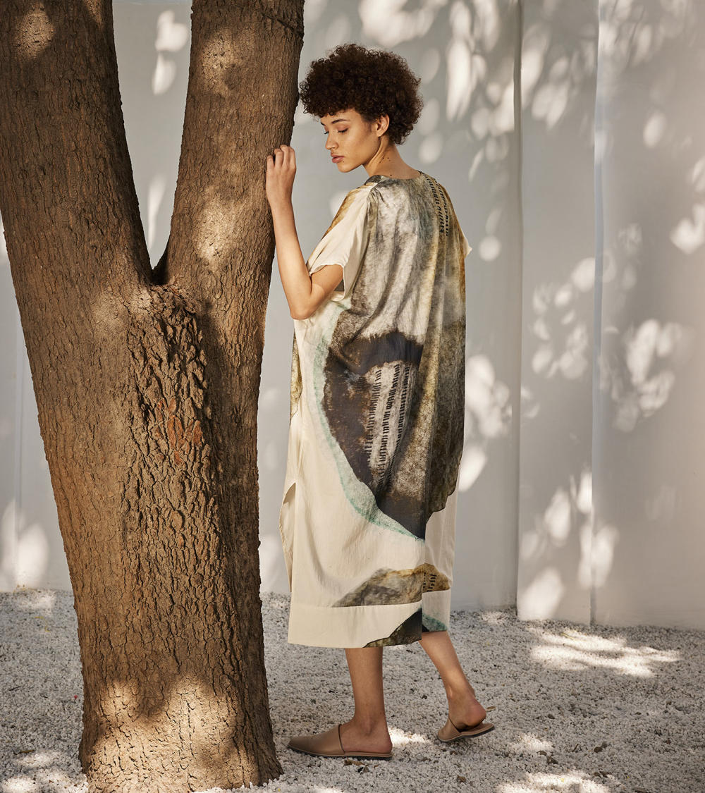 The lagoon series are layered with intuitive brushstrokes depicting sea scapes and reflecting on duality of life where control and spontaneity exists at the same time. The visual elements of a lagoon depict the calmness of your mind while still being connected to the sea of emotions one experiences. An off-white mulmul cotton kaftan dress with a front button opening, side slit and gathers at the shoulder.