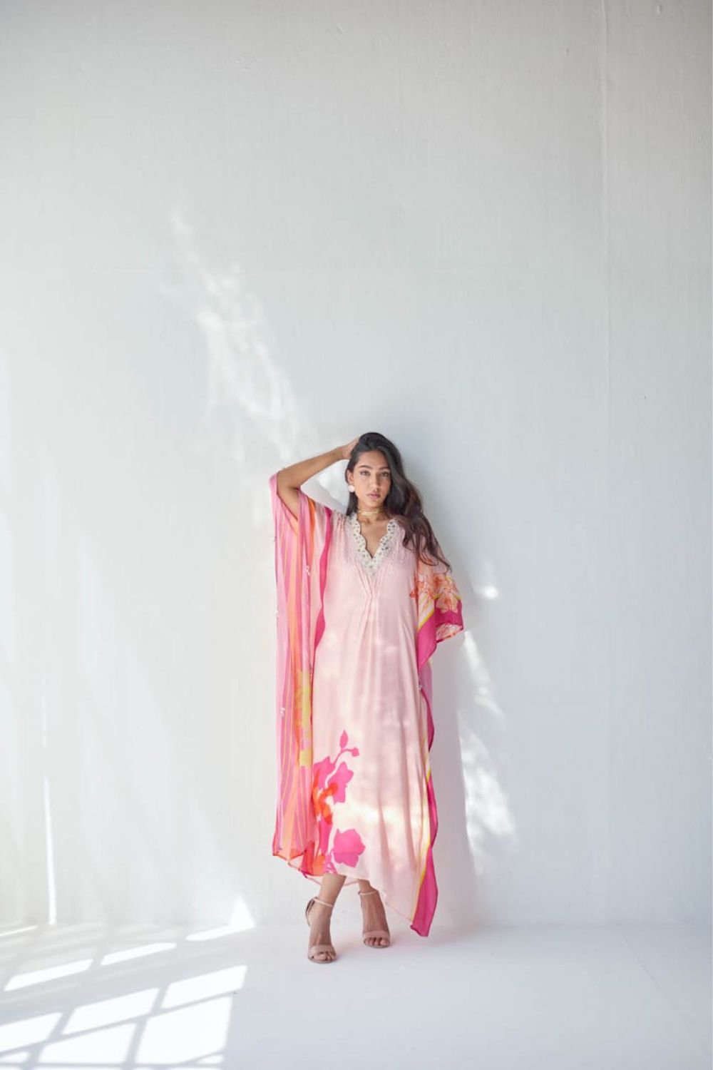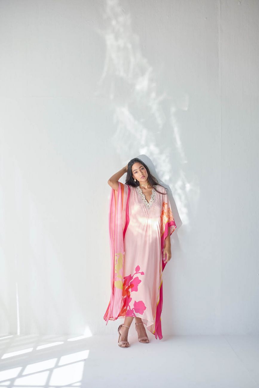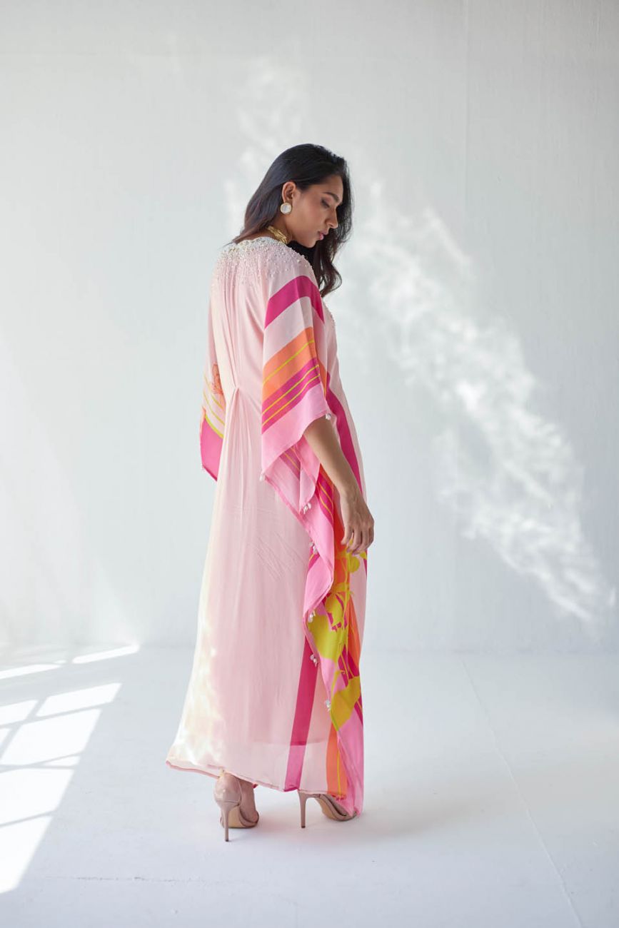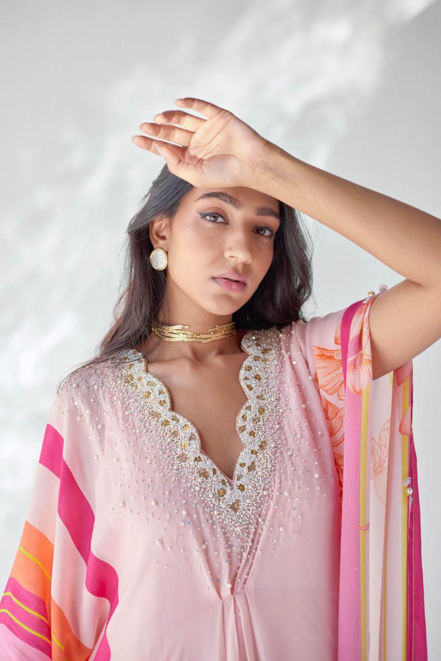 Nude Pink printed kaftan with intricate pearl hand embroidered scallop neck with centre pleat detailing.