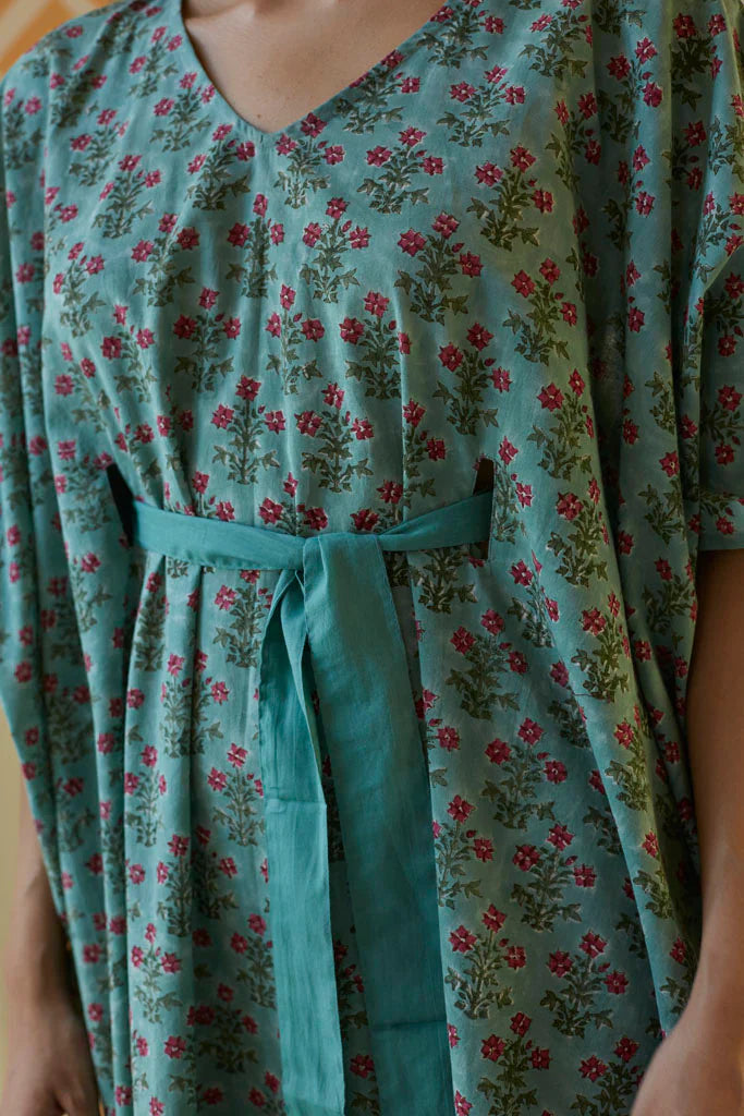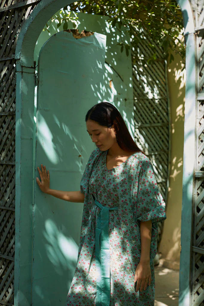 The silhouettes are simple but considered: relaxed cuts, thoughtful details, and fabrics that breathe — from handwoven cottons to delicately finished textiles rooted in Rajasthan’s craft culture. Colours stay close to the earth: muted florals, soft neutrals, and tones that age gracefully rather than fall out of season.