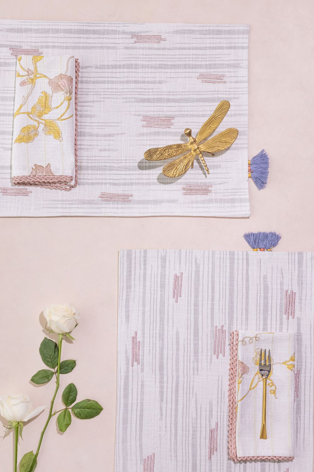 Our Bloom table mat set features delicate digital prints uplifted with embroidered details in geometric patterns. These are perfect for when you feel like adding a touch of spring and summer to your brunches. Handmade in India.
