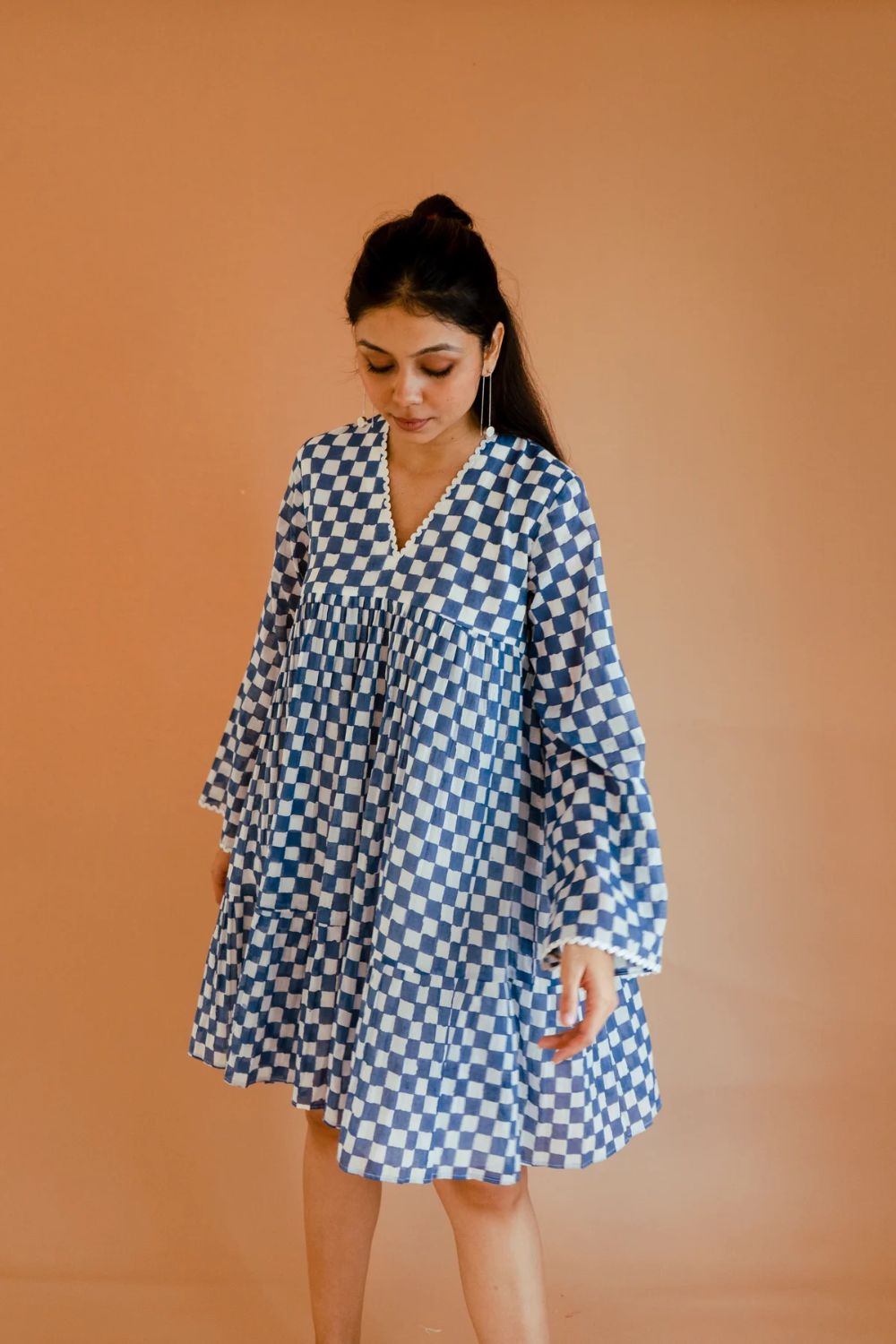 This ivory and blue checked cotton dress features a flattering V-neckline and full sleeves, offering a timeless silhouette. The short yoke is adorned with delicate pleating, adding texture and visual interest to the design. Crafted from breathable cotton, making it an ideal choice for both casual outings and semi-formal occasions. Its classic checkered pattern and thoughtful detailing make it a versatile addition to any wardrobe.