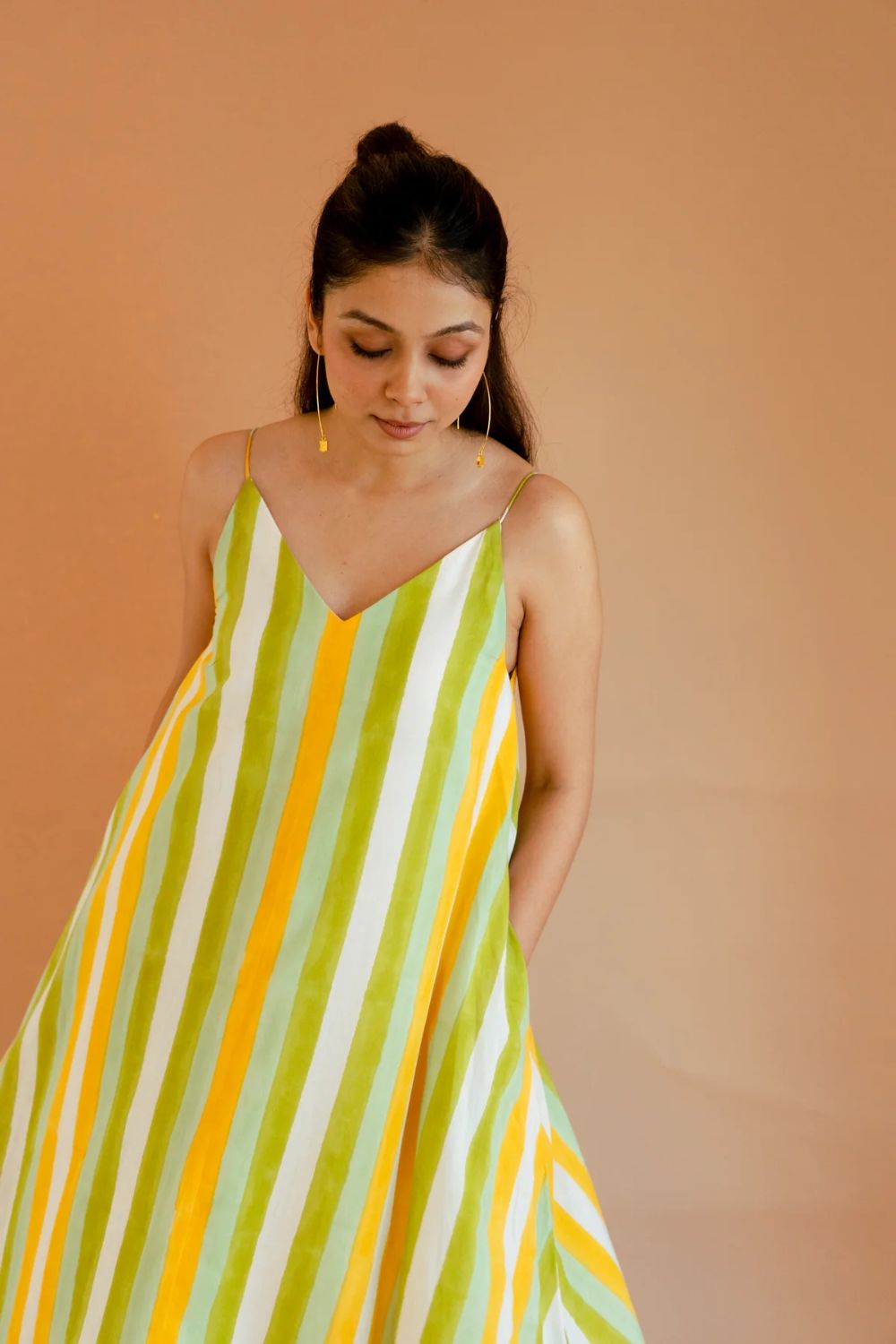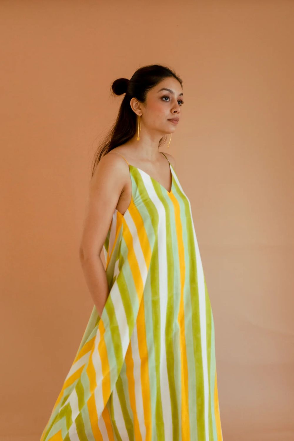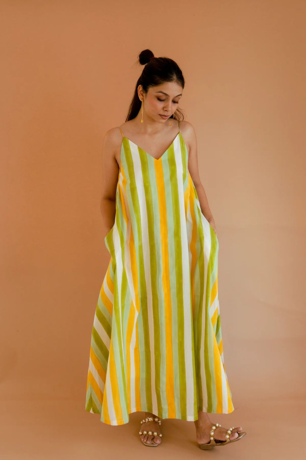 This striped A-line cotton dress features a fresh green and yellow color palette, offering a fresh and lively aesthetic perfect for summer. Designed with a relaxed fit, it ensures comfort and ease of movement, making it an ideal choice for warm-weather outings. The dress is thoughtfully equipped with pockets, adding both functionality and a touch of casual charm. Its breathable cotton fabric keeps you cool, while the playful stripes and practical design elements make it a versatile addition to your wardrobe.