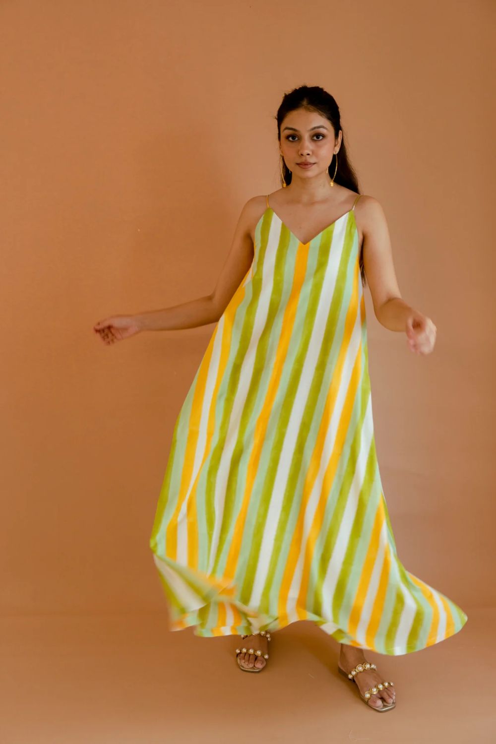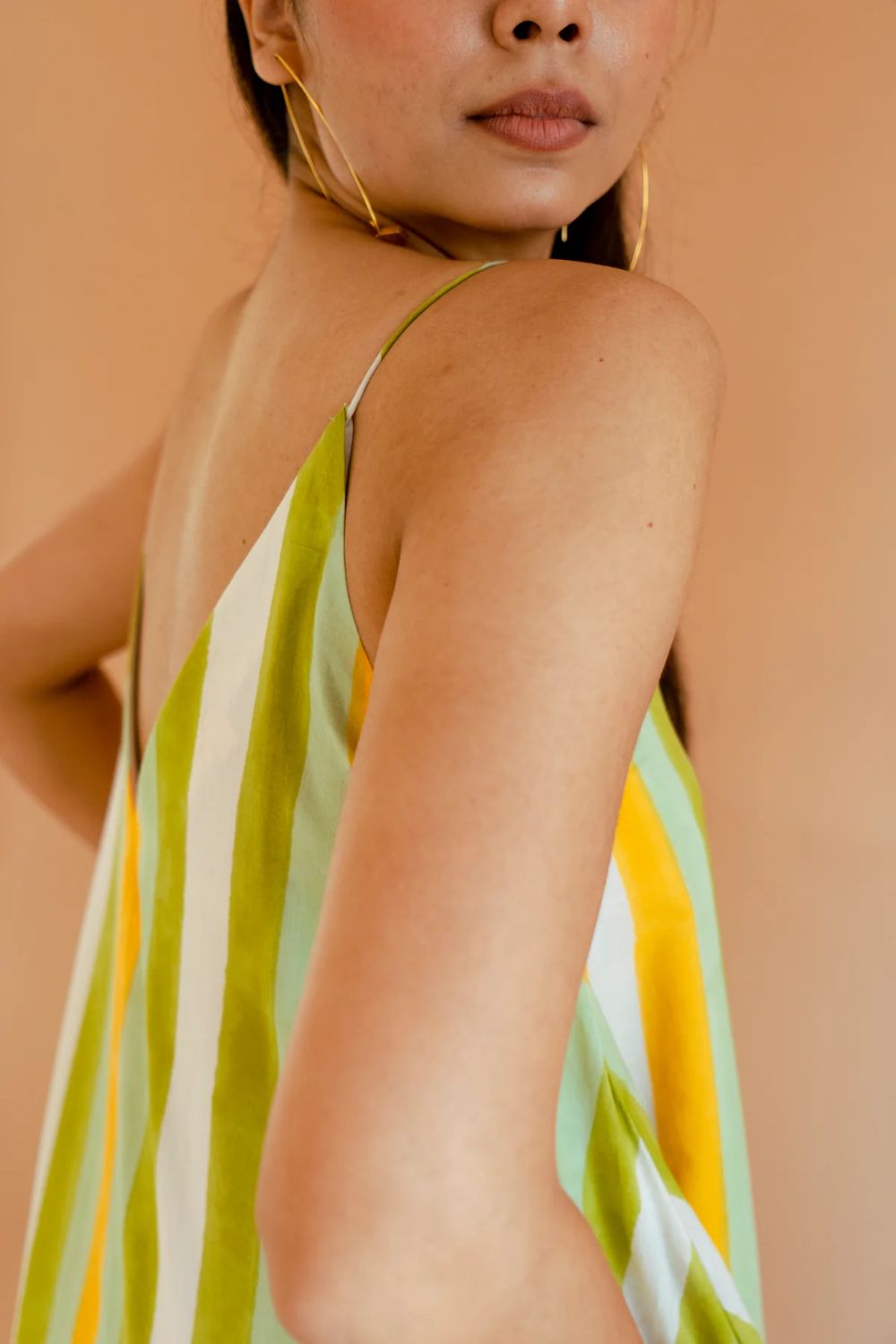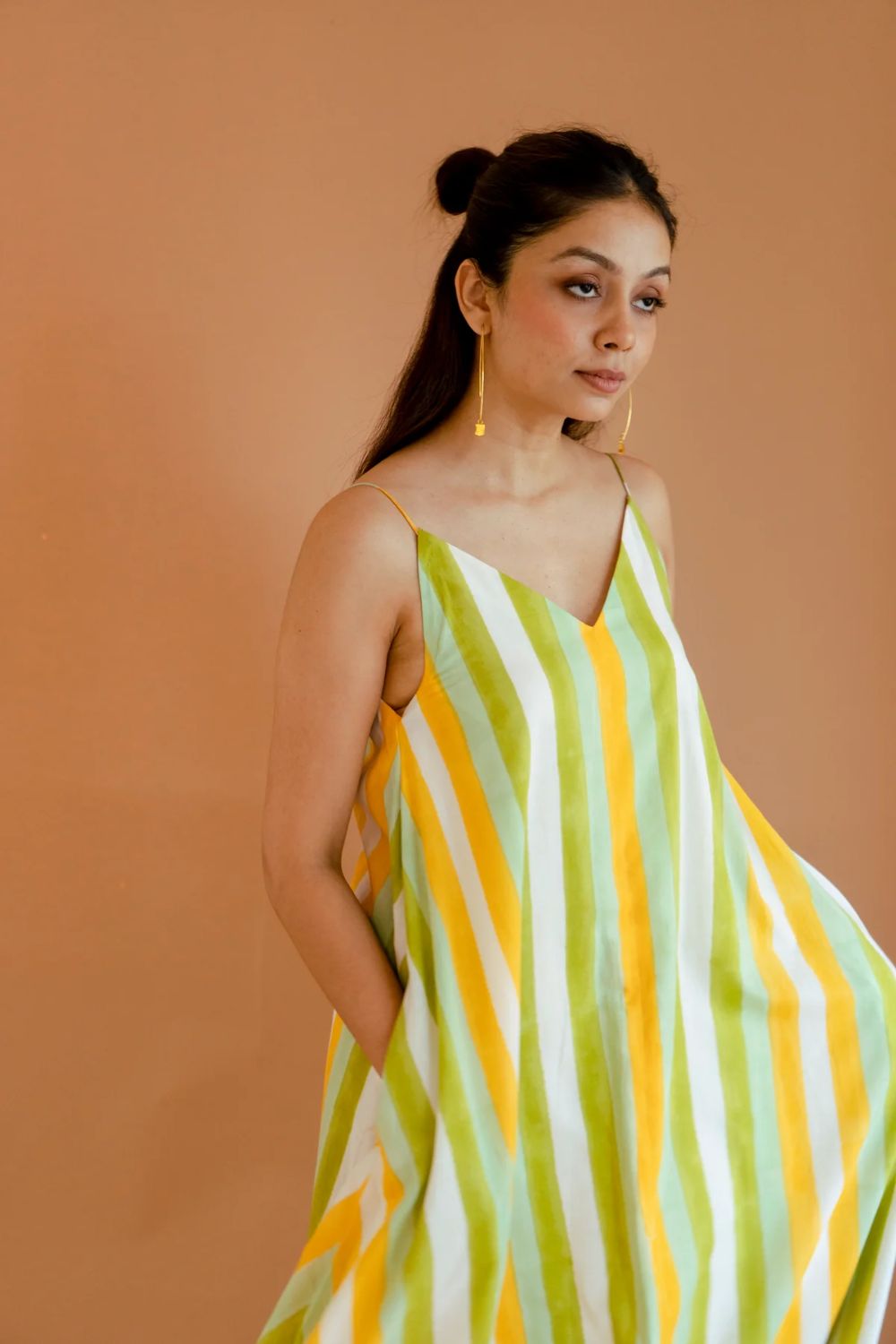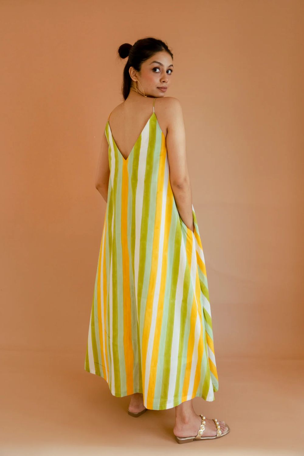 This striped A-line cotton dress features a fresh green and yellow color palette, offering a fresh and lively aesthetic perfect for summer. Designed with a relaxed fit, it ensures comfort and ease of movement, making it an ideal choice for warm-weather outings. The dress is thoughtfully equipped with pockets, adding both functionality and a touch of casual charm. Its breathable cotton fabric keeps you cool, while the playful stripes and practical design elements make it a versatile addition to your wardrobe.