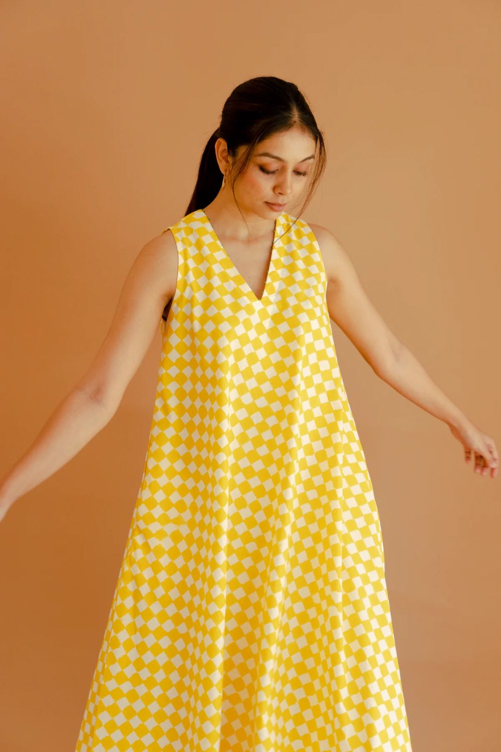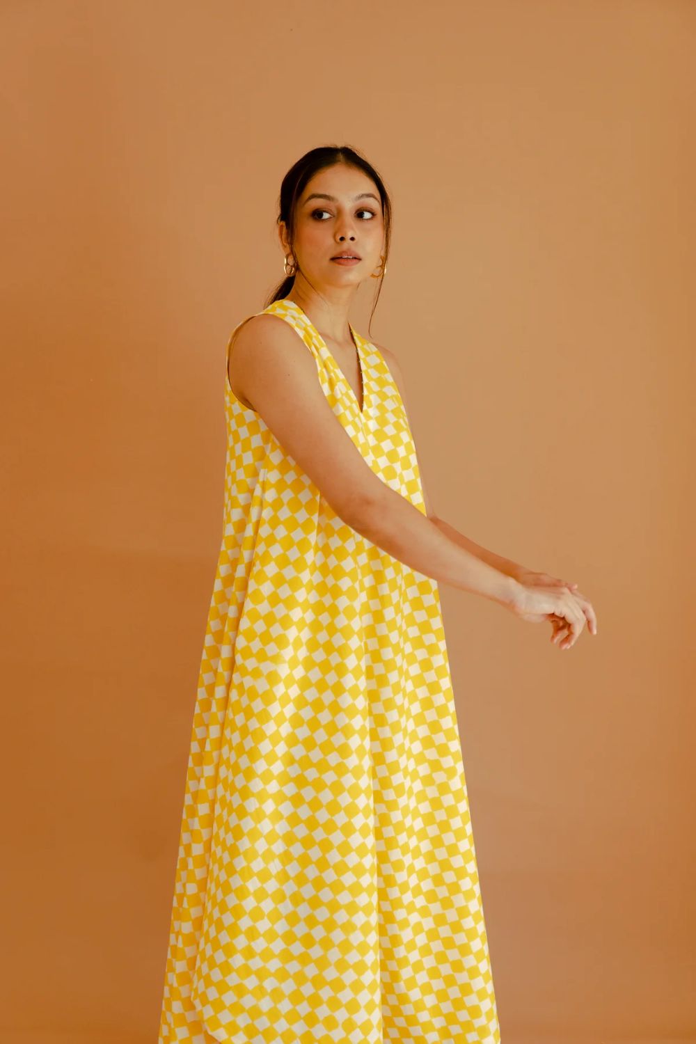 This white and yellow cotton checked sleeveless A-line dress exudes effortless charm and modern elegance. Its flattering V-neckline and clean A-line silhouette create a timeless look, while the thoughtfully added pockets offer both practicality and style. The standout feature is the beautifully handcrafted element at the back, which adds a unique and artisanal touch to the design. Perfect for casual outings or summer gatherings, this dress combines comfort with a touch of sophistication, making it a versatile addition to any wardrobe.