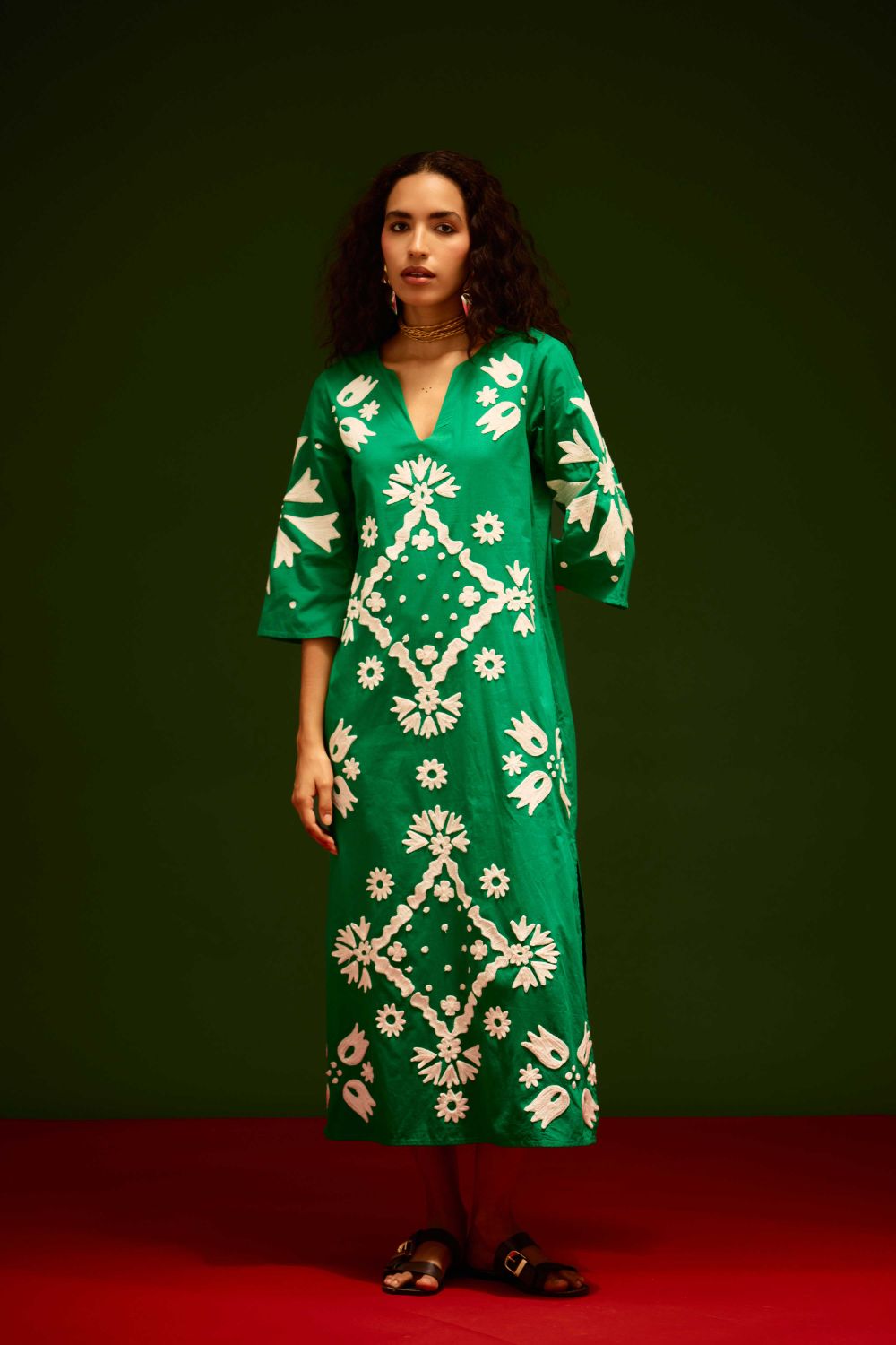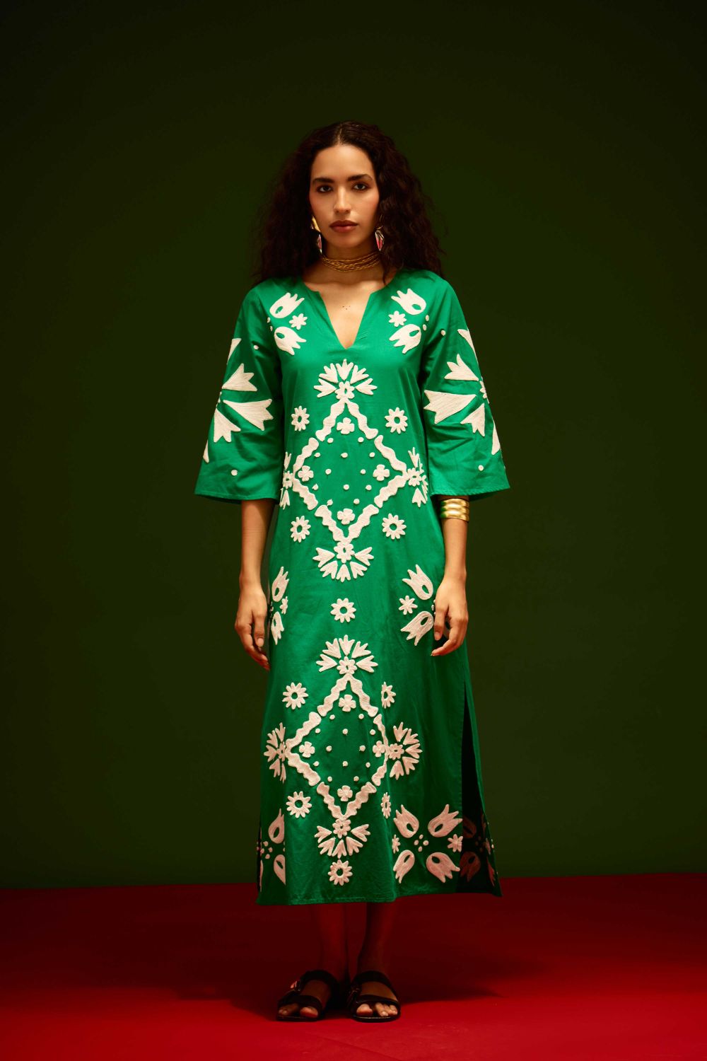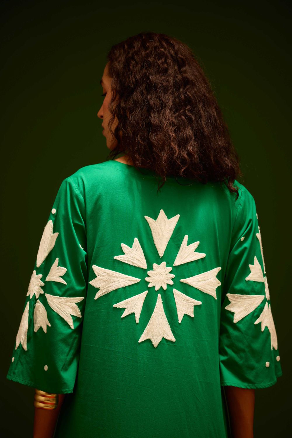 Avocado Green with Ivory Sitara Thread Embroidery Cotton Maxi Dress