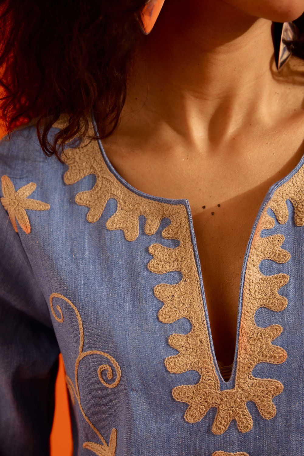 Denim Blue Cotton Maxi Dress with Natural Wave Thread Embroidery