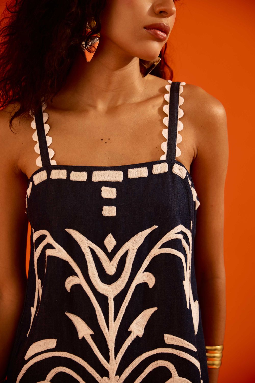 Midnight Blue Strappy Denim Shift Dress with Ivory Garden Thread Embroidery