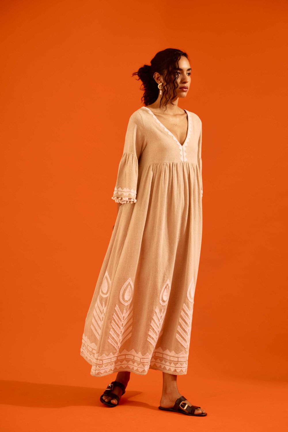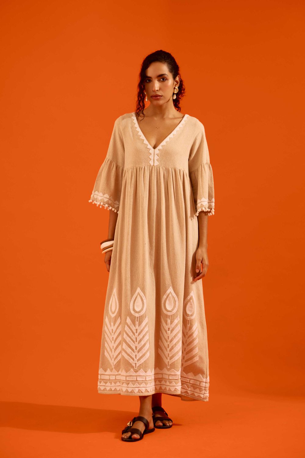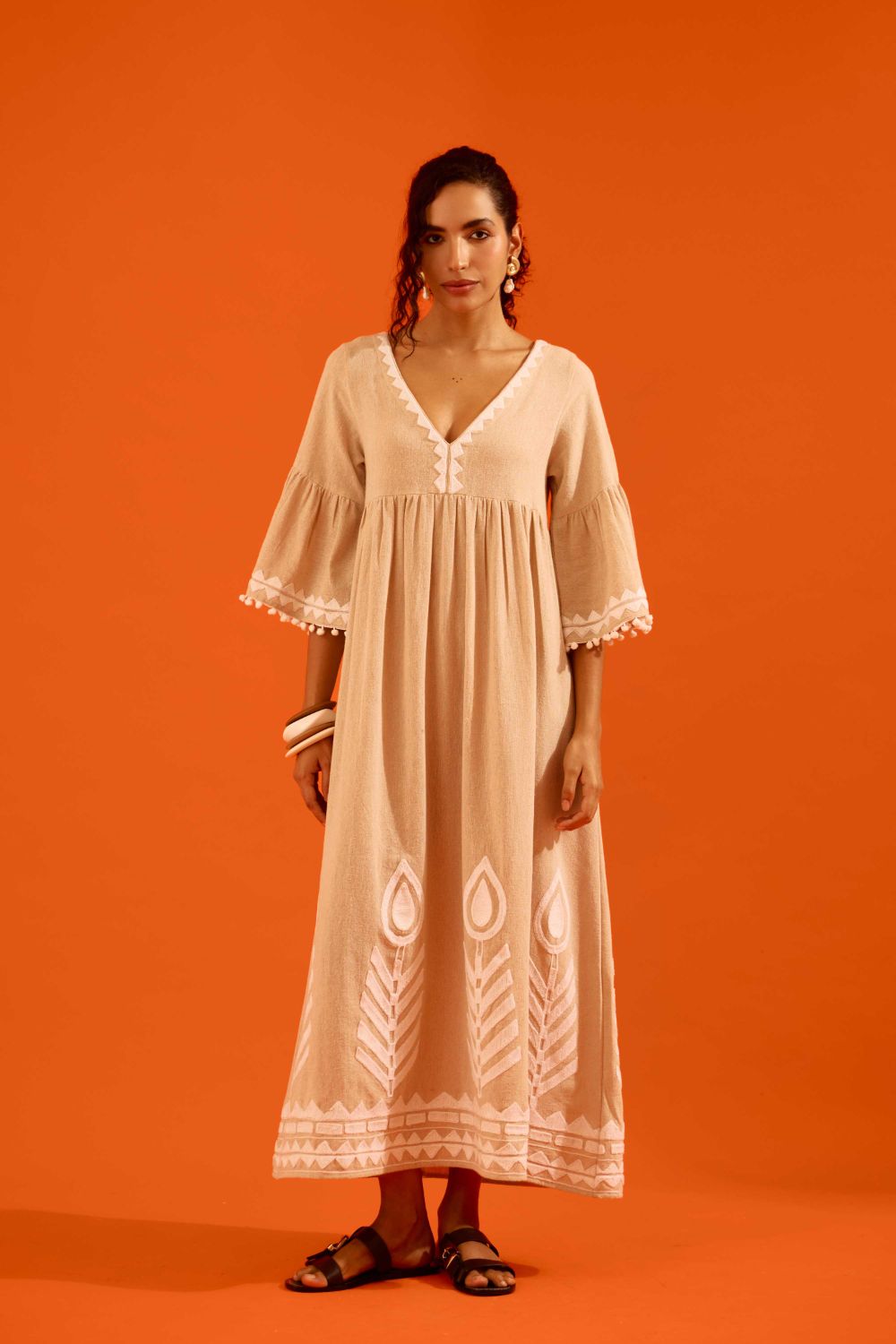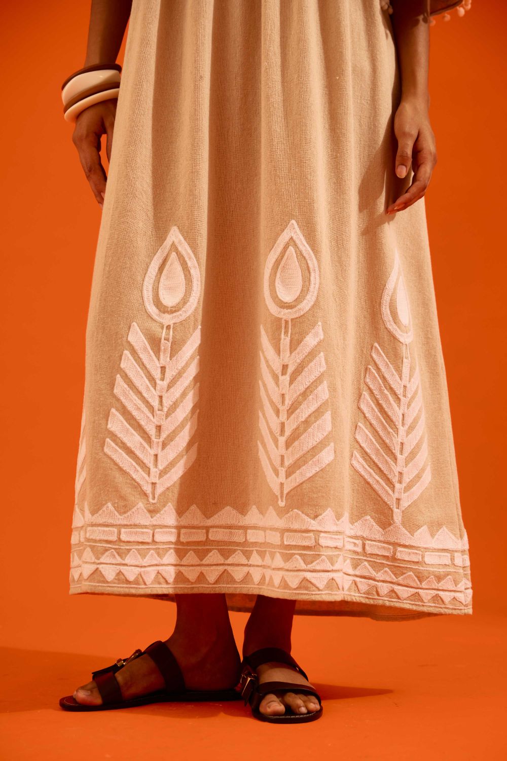 Natural Jute Maxi Dress with Ivory Petal Thread Embroidery