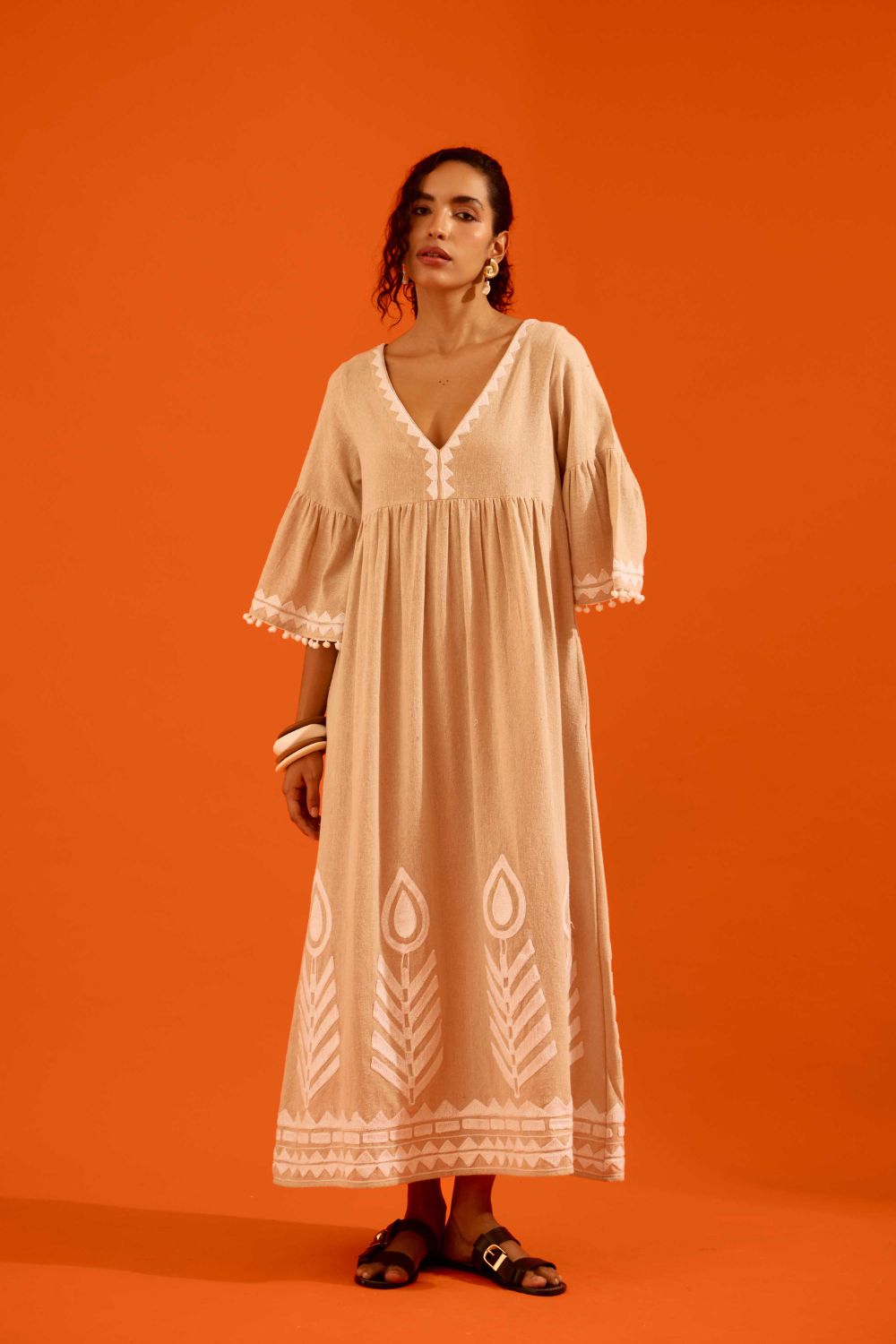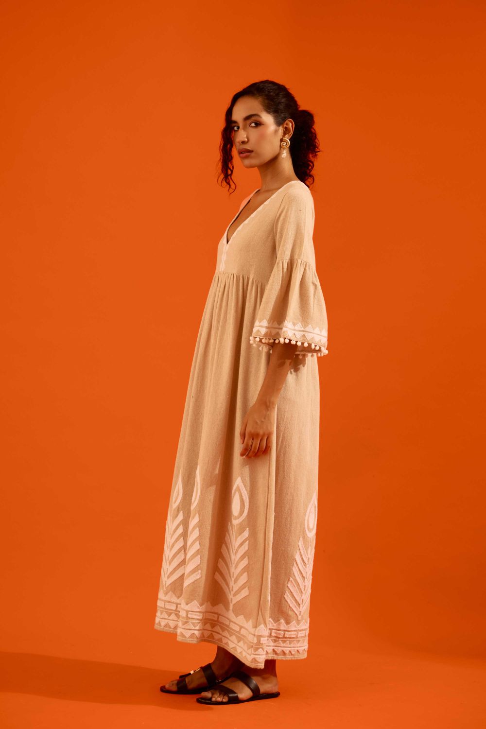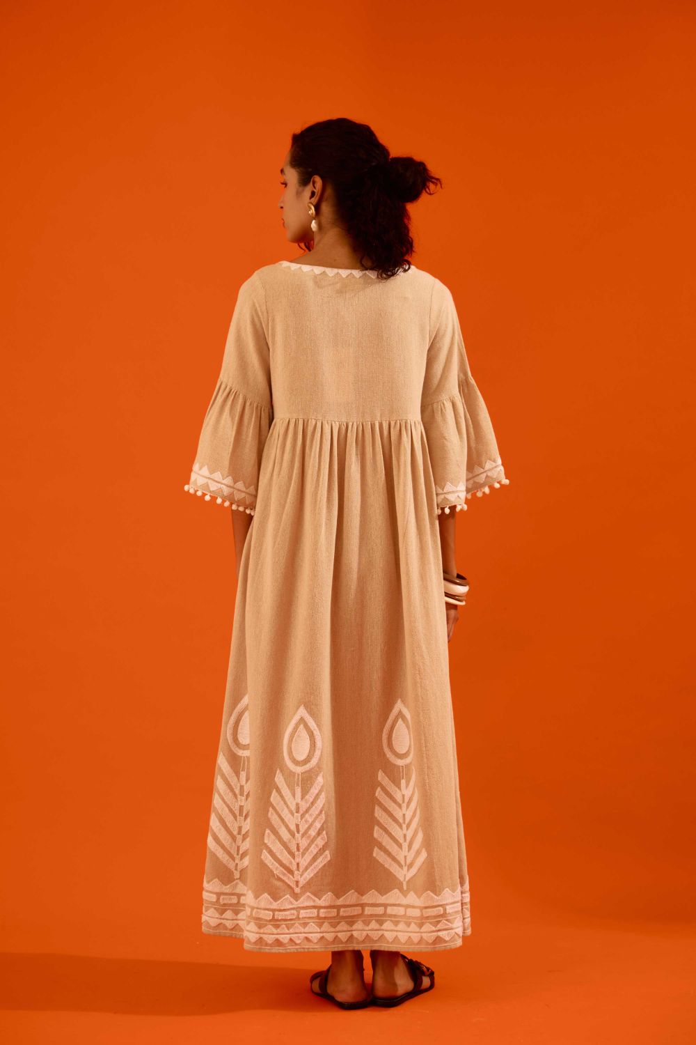 Natural Jute Maxi Dress with Ivory Petal Thread Embroidery