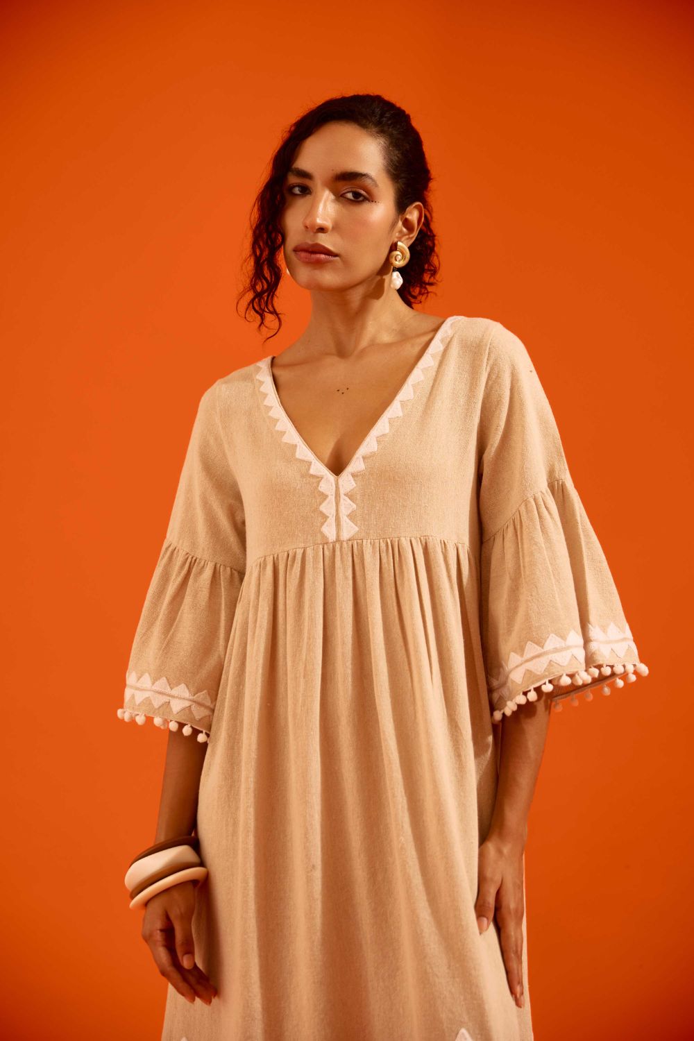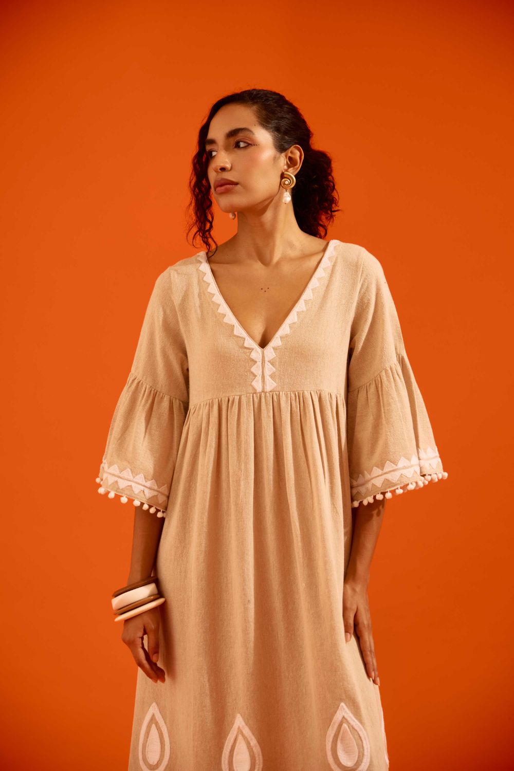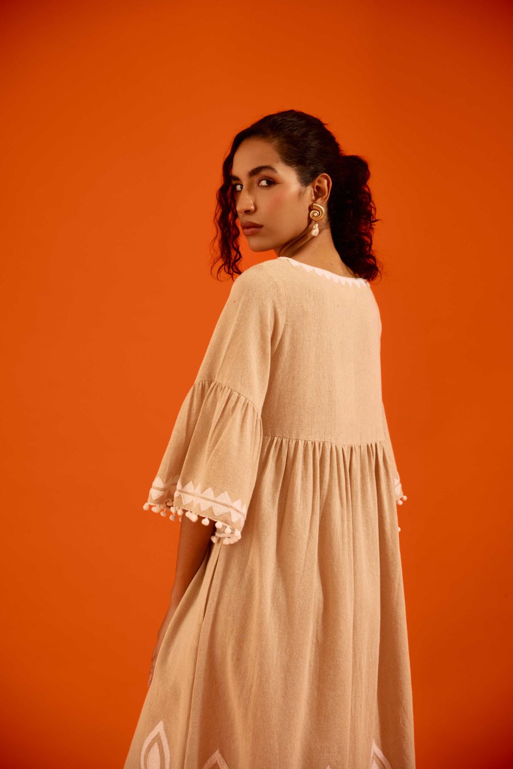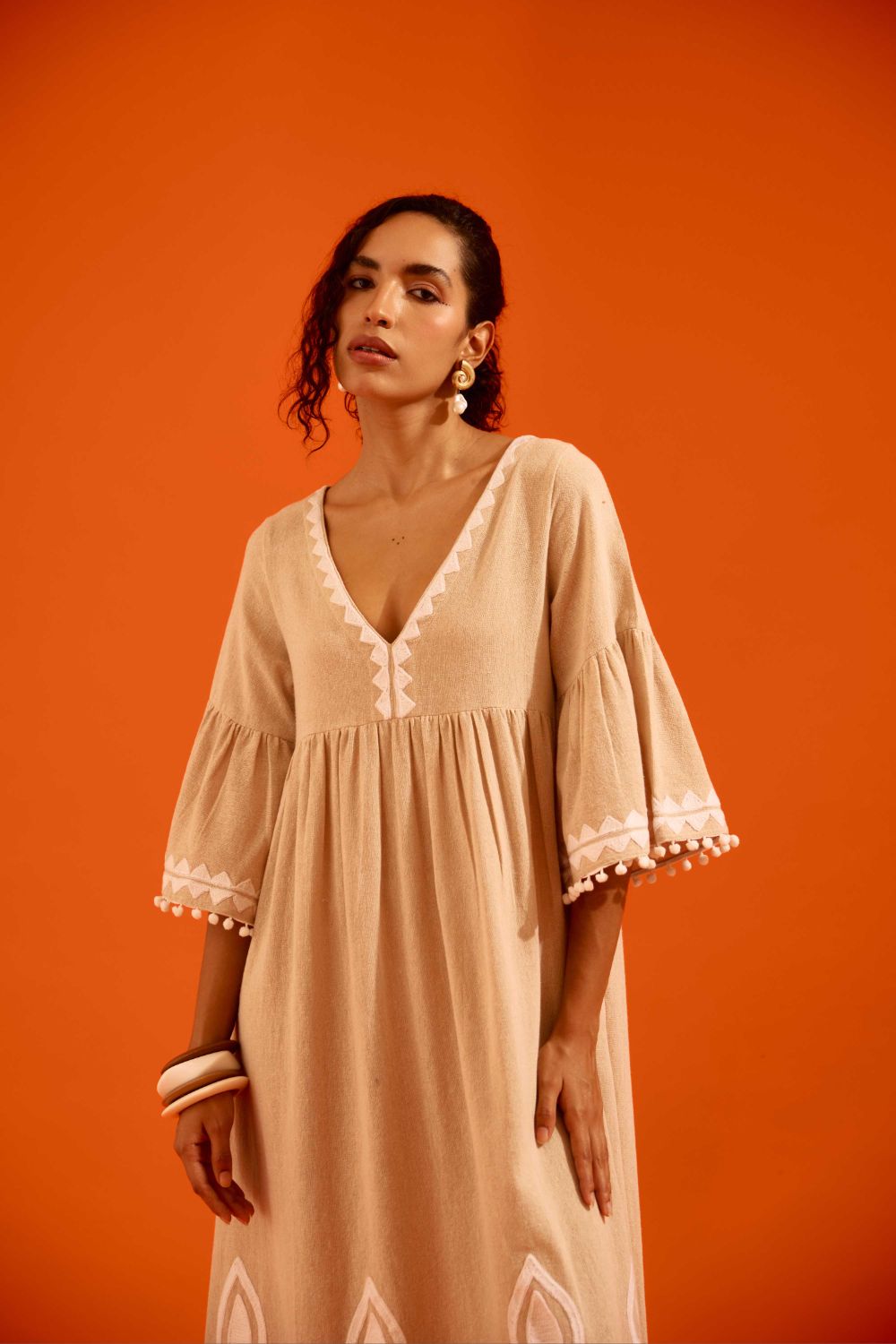 Natural Jute Maxi Dress with Ivory Petal Thread Embroidery