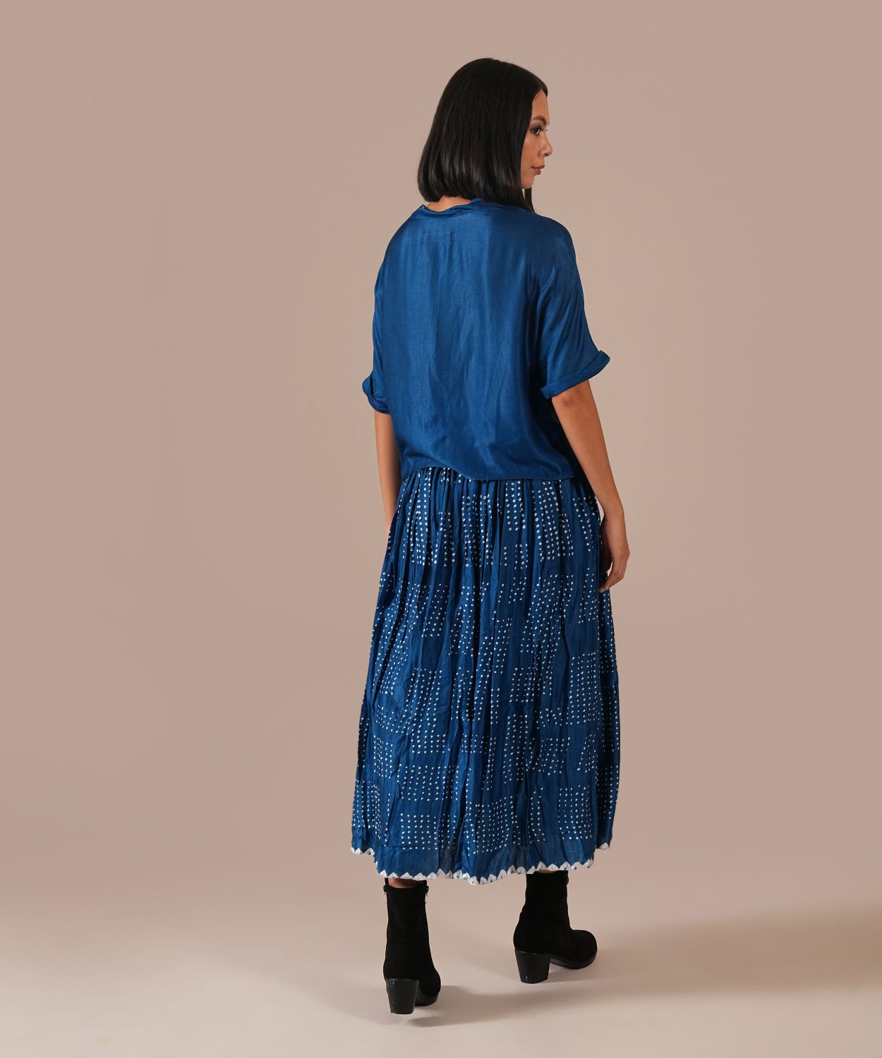 This ensemble is a masterful blend of heritage and contemporary elegance: a gathered silk bandhani skirt with side pockets, a sleek silk boxy top with a versatile Bandhani tie belt. Each piece showcases artisanal craftsmanship, luxurious textures, and effortless sophistication. It is a celebration of India’s rich handloom legacy, now reinterpreted for the modern wardrobe.