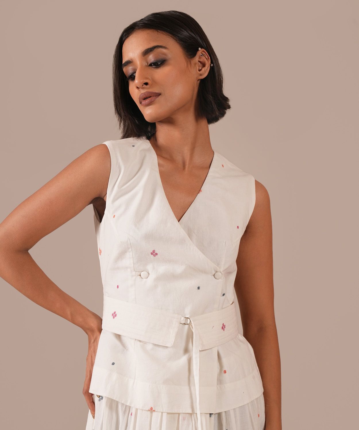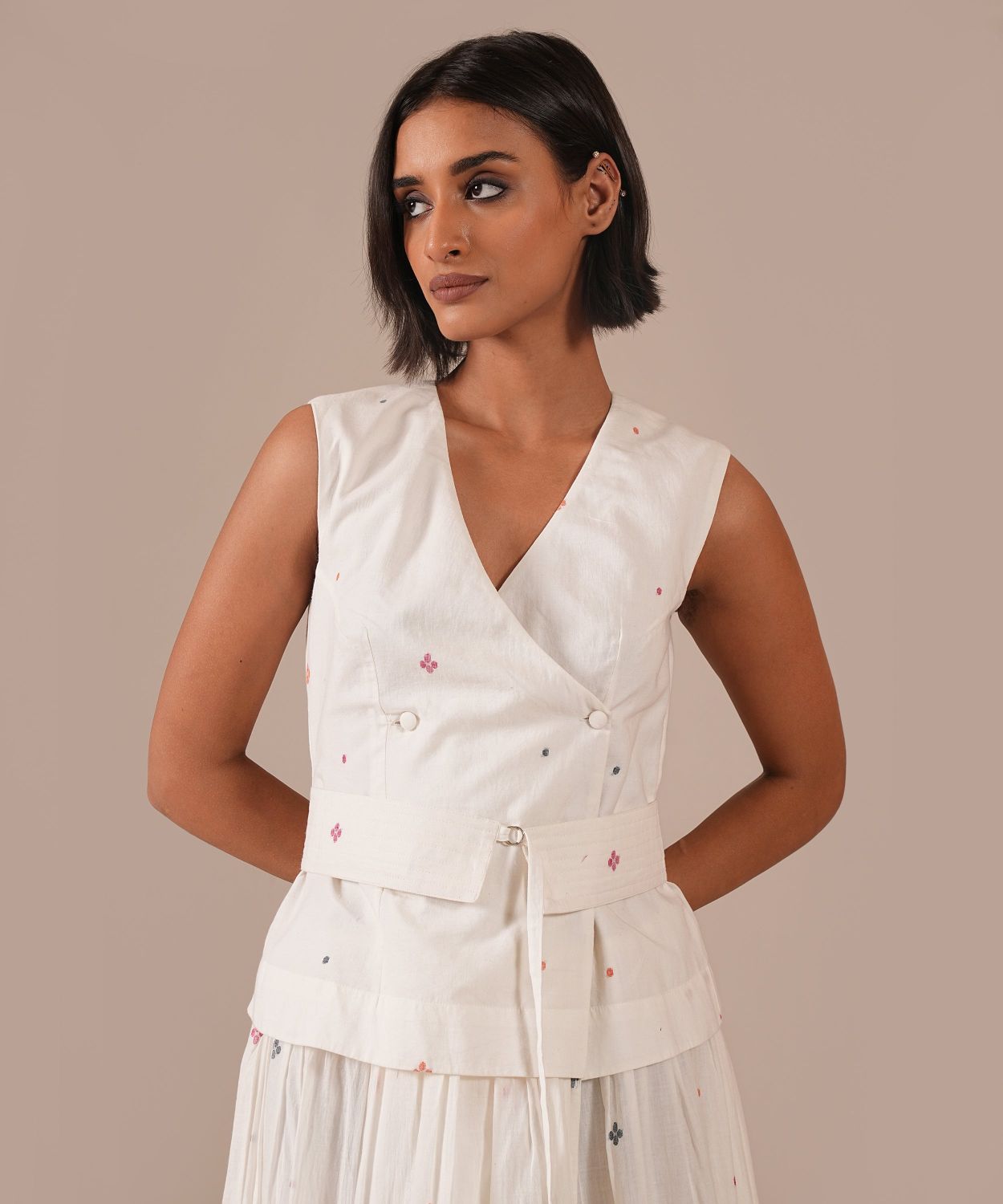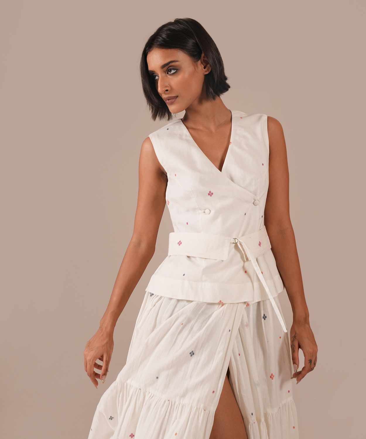 A classic double-breasted wrap dress featuring a tiered silhouette and a quilted belt. Thoughtfully designed to create the illusion of a skirt paired with a top, while in reality it’s a single, effortlessly chic dress.