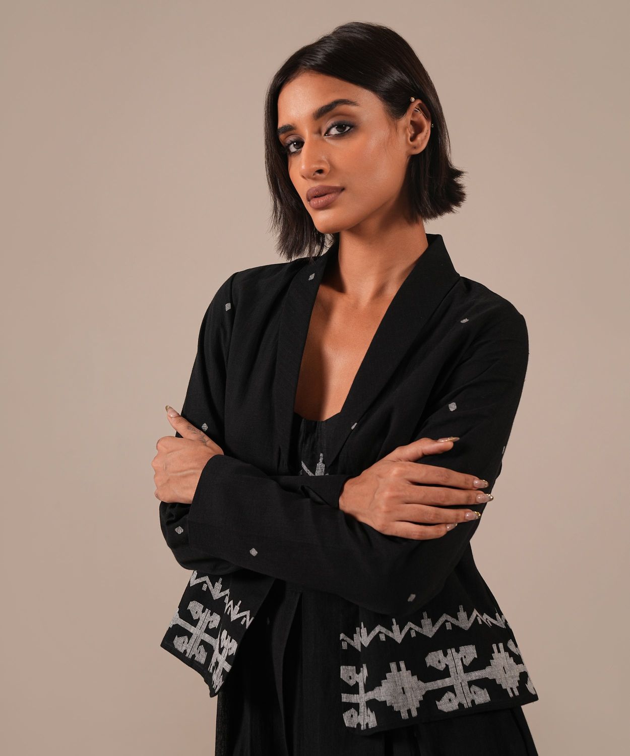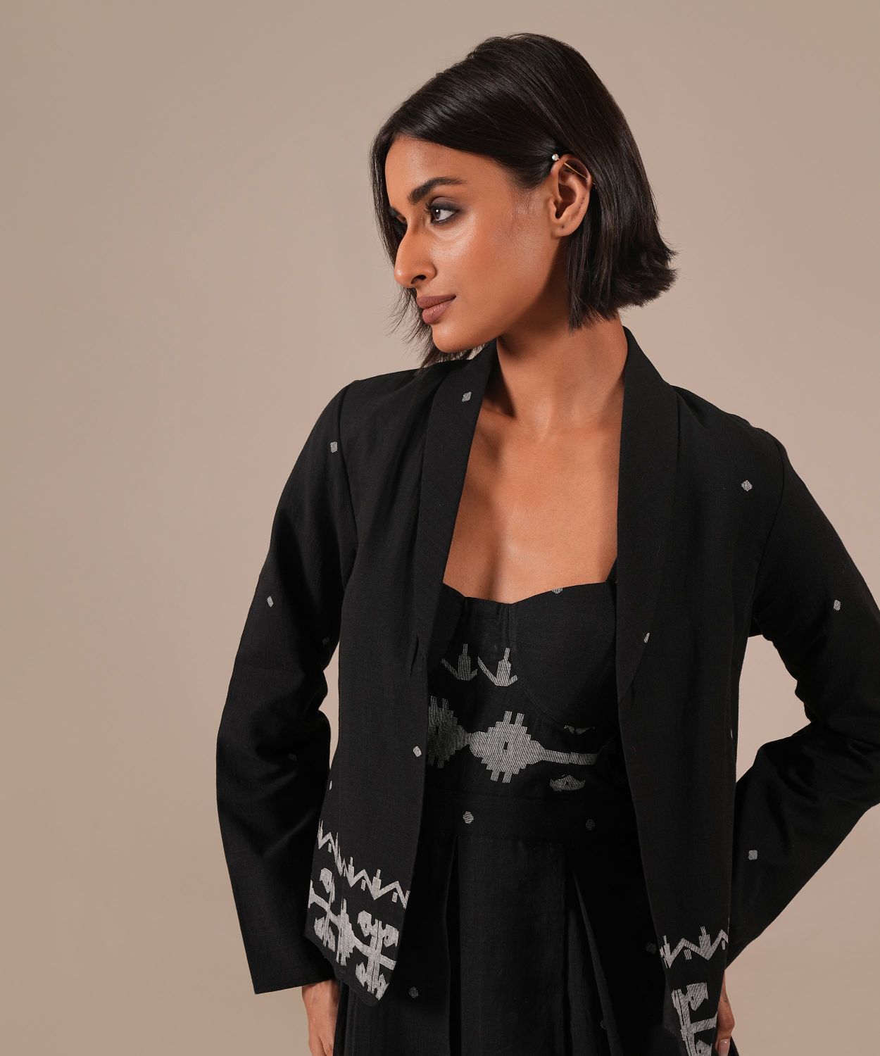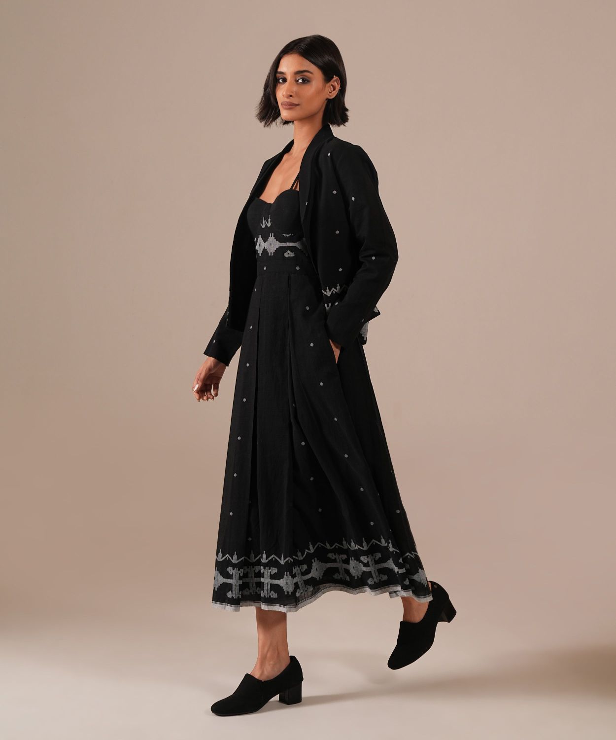 A Jamdani bralette dress with elegant box pleats, adjustable straps and side pockets, paired with a tailored co-ord jacket. Handwoven by skilled artisans, combining traditional craftsmanship with contemporary style.