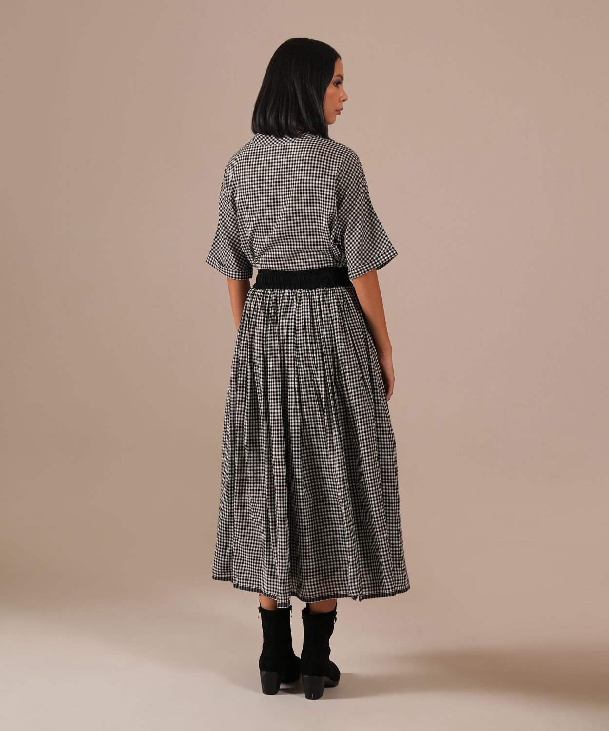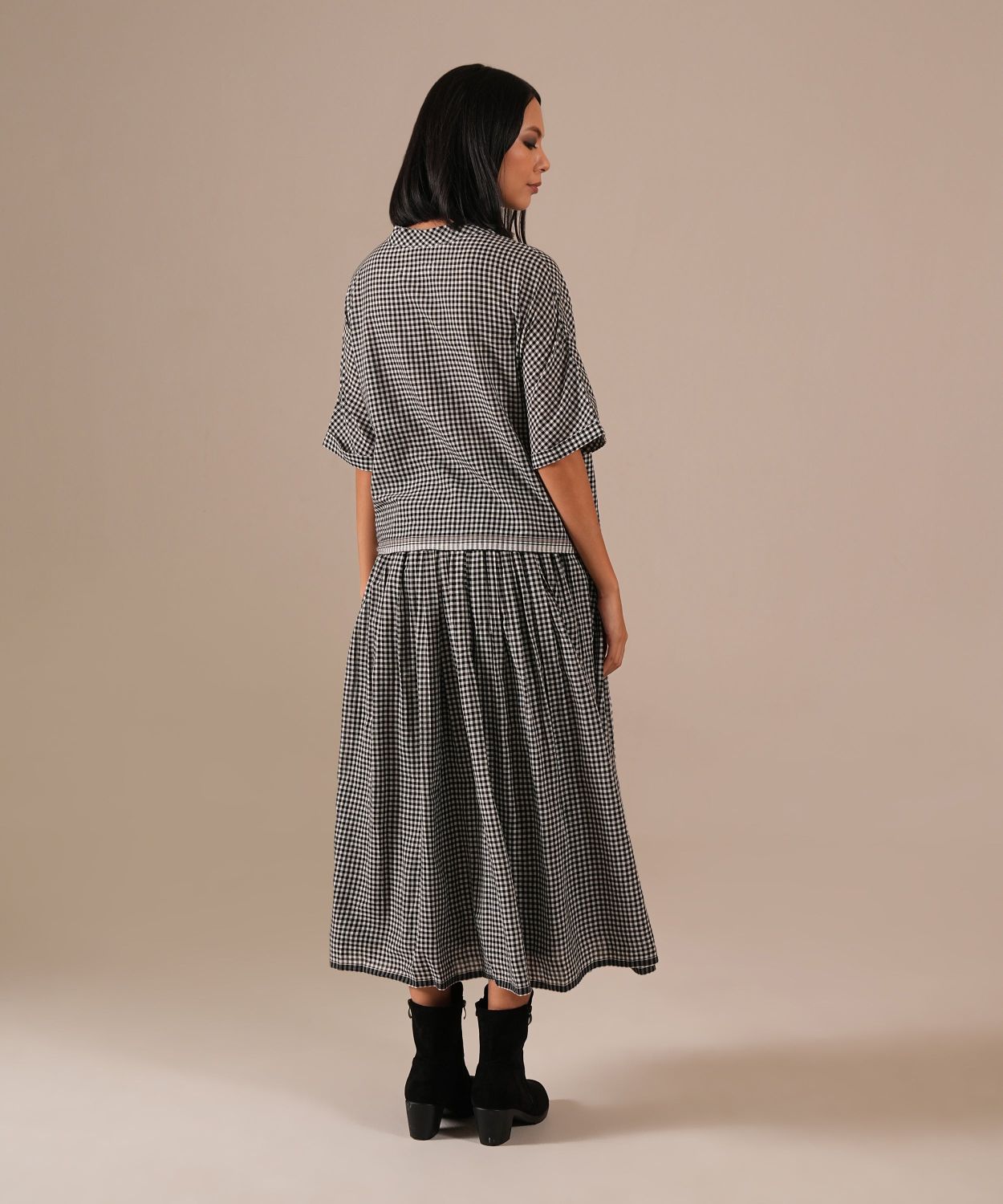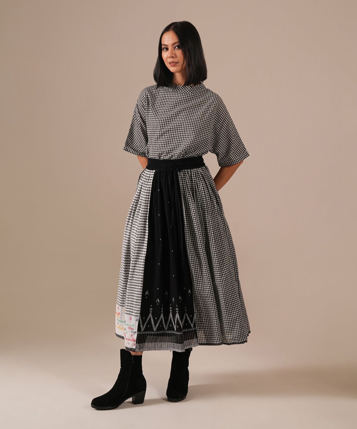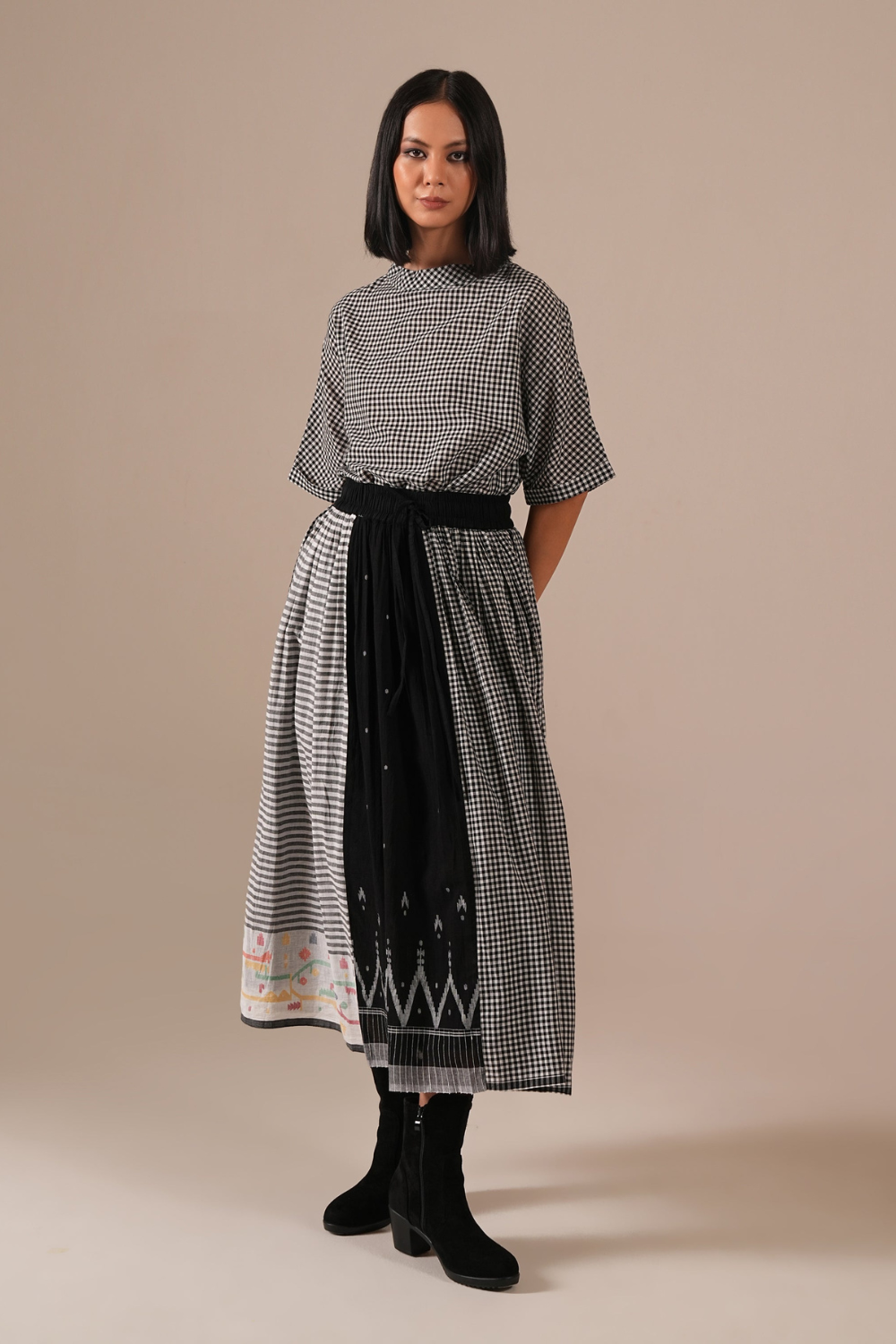 A classic Jamdani ensemble with a boxy top and gathered skirt accented with contrast Jamdani panel details, elasticated waist and convenient side pockets — timeless craftsmanship meets everyday ease.