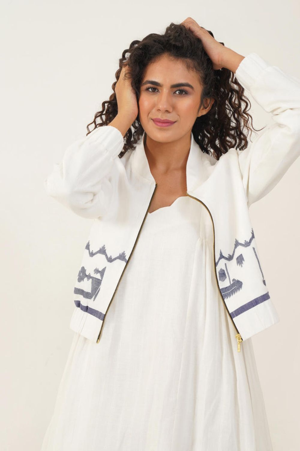 Intricately woven Jamdani bomber jacket fuses traditional craftsmanship with contemporary flair, creating a refined and distinctive look perfect for making a memorable impression.