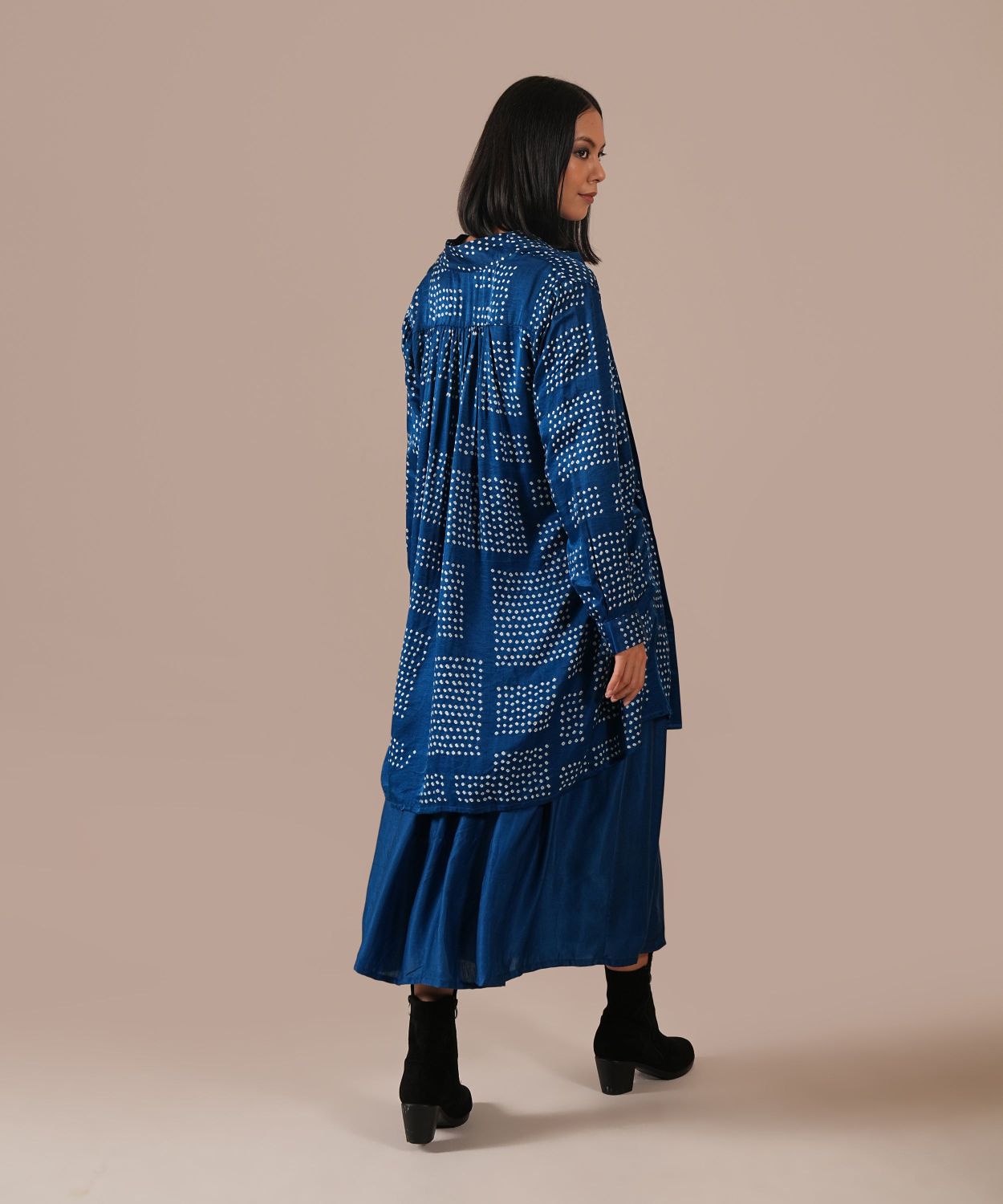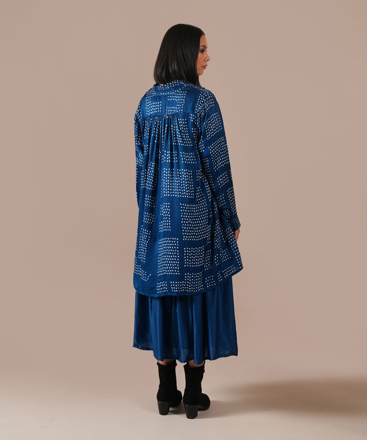 This ensemble is a masterful blend of heritage and contemporary elegance: a gathered silk skirt with side pockets, a sleek silk boxy top, and a silk Bandhani overlay that doubles as a chic shirt, cinched with a versatile Bandhani tie belt. Each piece showcases artisanal craftsmanship, luxurious textures, and effortless sophistication. It is a celebration of India’s rich handloom legacy, now reinterpreted for the modern wardrobe.