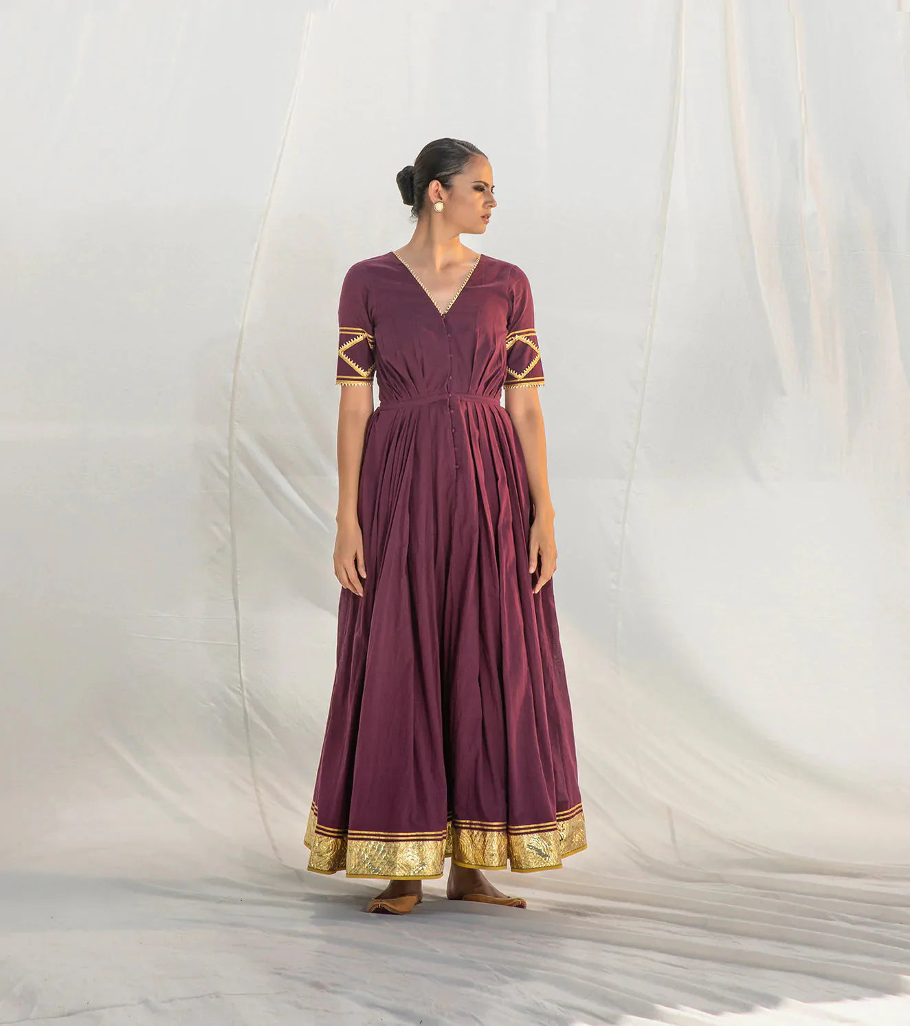 Stand out in a flash with this sweeping maxi dress. Crafted in 100% pure mulmul fabric, this gorgeous piece features a front button panel and a fitted body that flares down from the waist below. This breath-taking beauty is a standout with its multiple layers, contrasting piping and delicate gota work that runs all along the hemline.